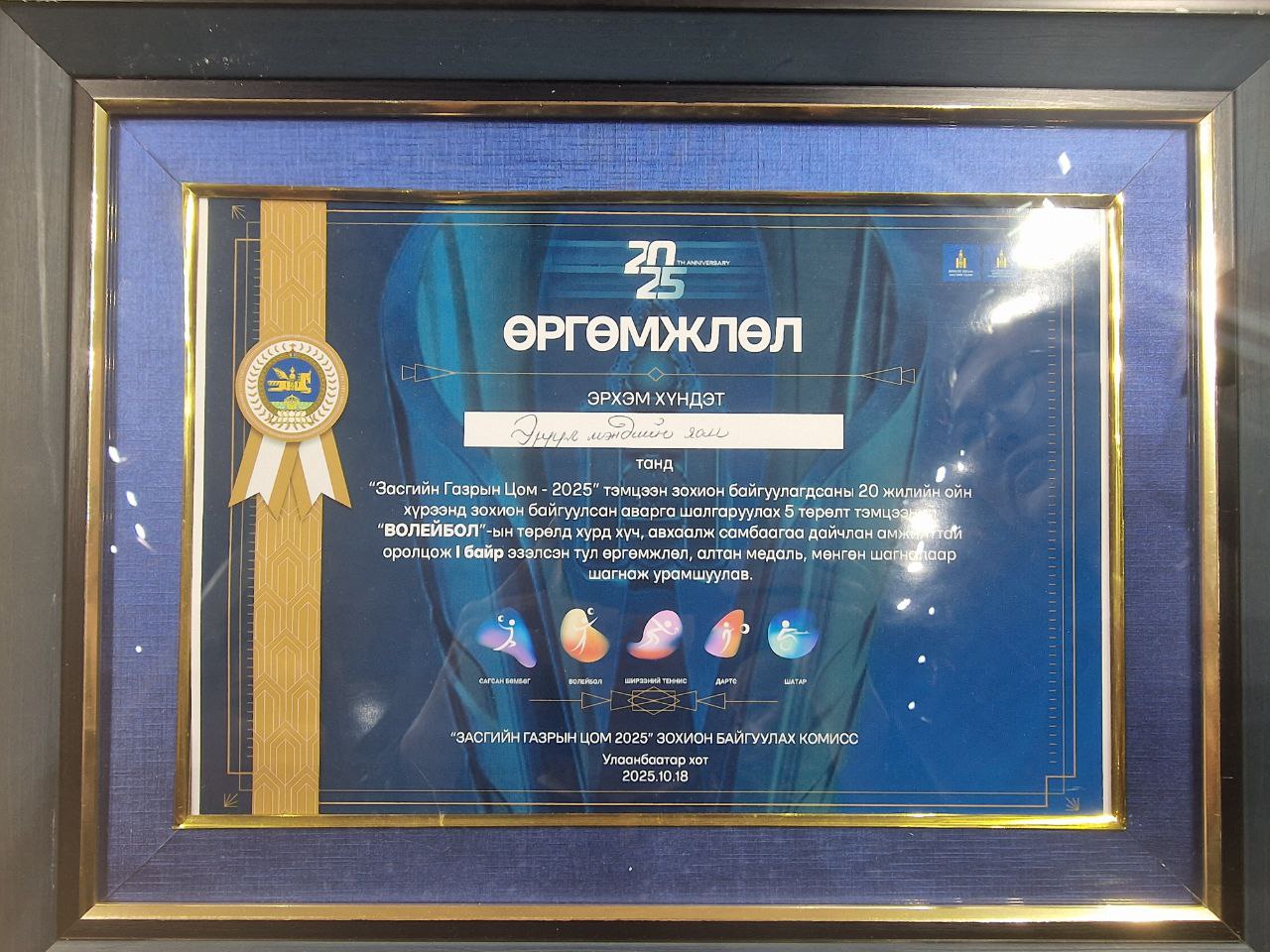 Төрийн захиргааны төв байгууллагуудын дунд жил бүр уламжлал болгон зохион байгуулагддаг "Засгийн газрын цом-2025” спортын их наадам 2025 оны 10 дугаар сарын 13-аас 18-ны өдрүүдэд боллоо. Эрүүл мэндийн яамны баг тамирчид эрэгтэй волейболын төрөлд анх удаа АЛТАН МЕДАЛЬ хүртсэн амжилтыг гаргалаа. 2005 онд анхны тэмцээнийг зохион байгуулж байсан ба 20 дахь жилийн ой дээр ийнхүү Алтан медаль хүртлээ.