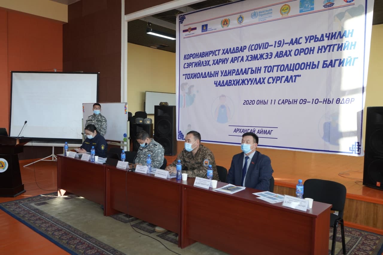 Шадар сайдын 2020 оны 89 тоот тушаалаар томилогдсон ажлын хэсэг орон нутаг дахь “Тохиолдлын удирдлагын тогтолцооны багийг чадавхижуулах” цогц сургалтыг Архангай аймгийн Цэцэрлэг хотод зохион байгуулж байна. Сургалт 11 дүгээр сарын 9,10-ны өдрүүдэд өглөөн 09:00-18:00 хүртэл 2 өдөр үргэлжлэх юм. Цар тахлын үеийн бэлэн байдлыг хангуулах чиглэлээр салбар хоорондын уялдаа холбоог сайжруулах, онол арга зүйн хичээлээр эхний өдрийн сургалт эхлэж байна..jpg)