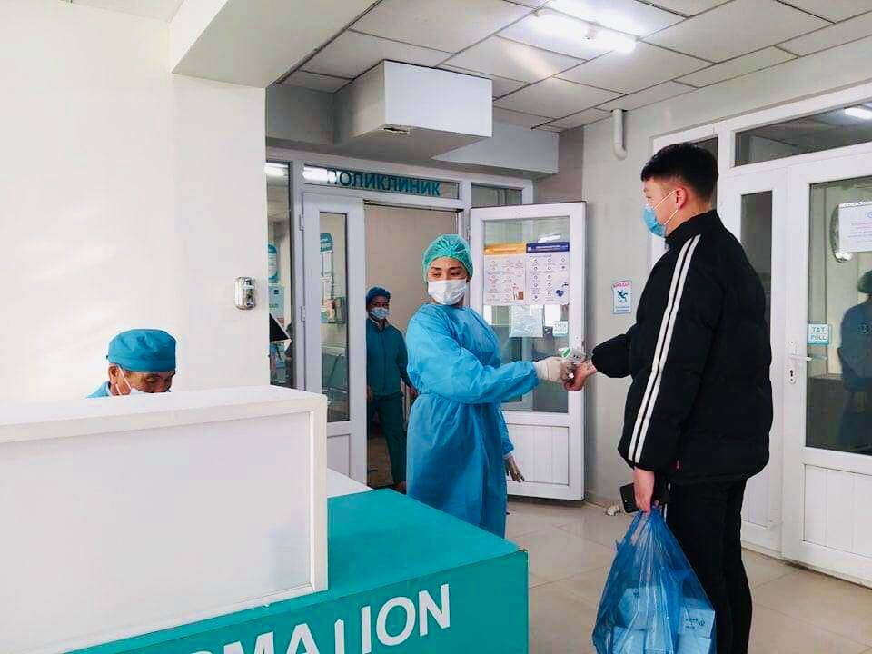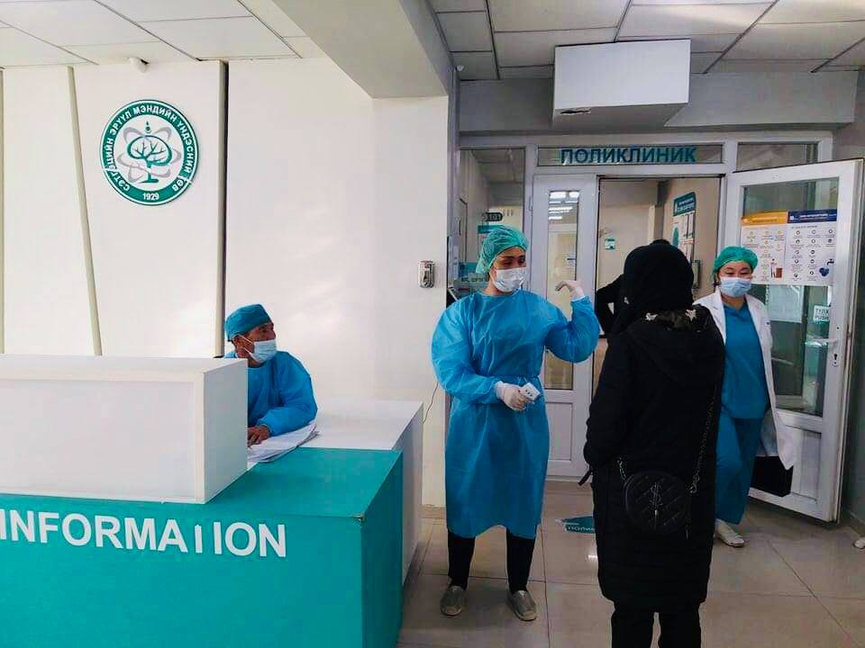 Эмнэлгийн төв үүдэн хэсэг, Зөвлөх поликлиник, Яаралтай тусламжийн тасгуудын үүдэнд халуун хэмжиж, амны хаалтын хэрэглээг хянан, эмчлүүлэгч, үйлчлүүлэгчийн гарыг халдваргүйжүүлэн ажиллаж байна.