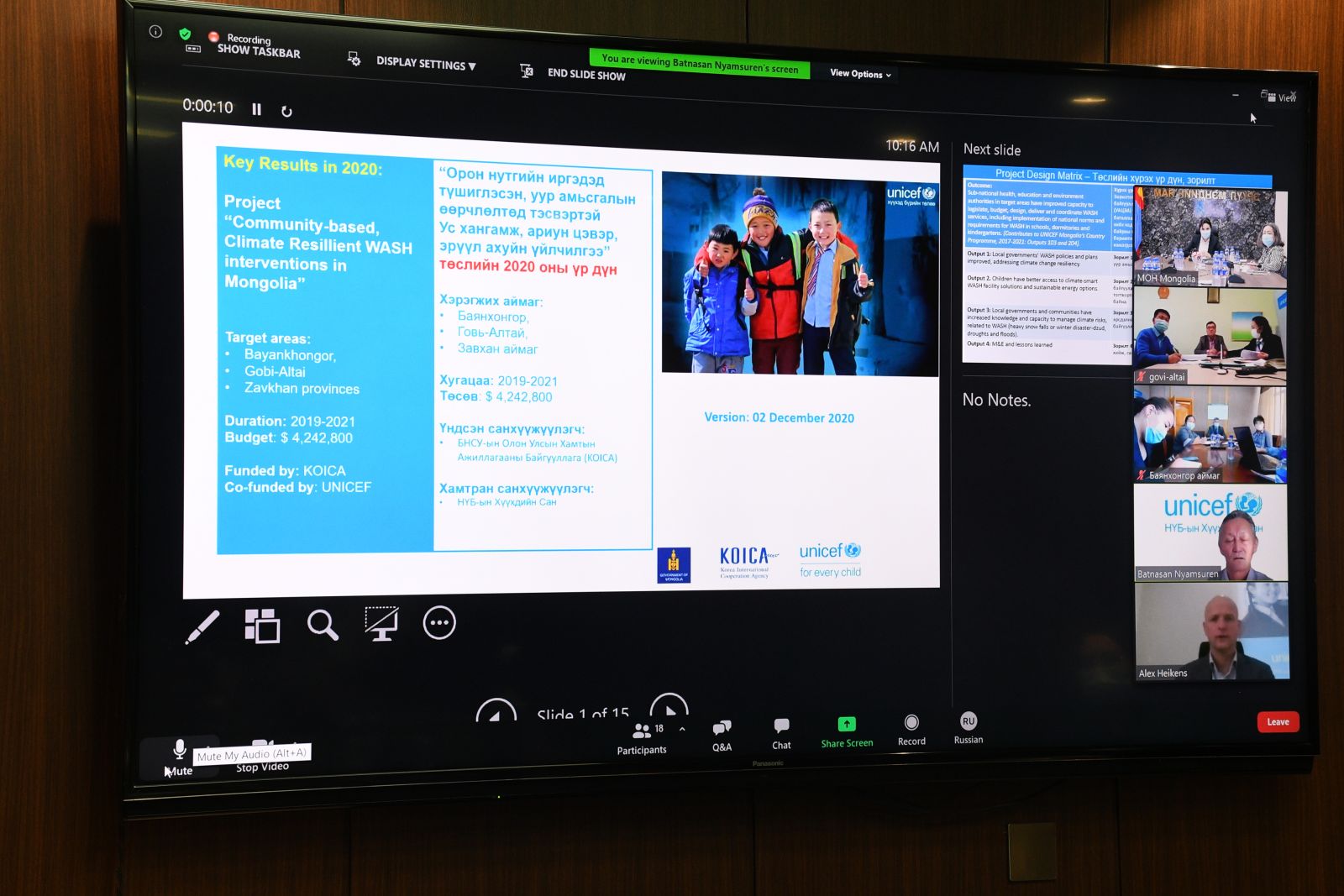 БНСУ-ын Олон улсын хамтын ажиллагааны байгууллага, НҮБ-ын Хүүхдийн сантай хамтран 2019-2021 онуудад Баянхонгор, Говь-Алтай, Завхан аймагт “Орон нутгийн иргэдэд түшиглэсэн, уур амьсгалын өөрчлөлтөд тэсвэртэй ус хангамж, ариун цэвэр, эрүүл ахуйн үйлчилгээ” төслийг 4,500,000 ам.долларын санхүүжилтээр хэрэгжүүлэхээр 2019 онд 3 талт Хэлэлцээрийн протоколыг Сангийн яам, Эрүүл мэндийн яам, КОЙКА хамтран баталсан юм.Уг төслийн зөвлөх хорооны даргаар Эрүүл мэндийн дэд сайд Ш.Анхмаа, дэд даргаар НҮБ-ын Хүүхдийн Сангийн Суурин төлөөлөгч Алекс хайкенс болон гишүүдэд Эрүүл мэндийн яам, НҮБ-ын Хүүхдийн сангийн уг төслийн ажлын алба болон дээрх 3 аймгуудын Засаг даргын тамгын газар, БНСУ-ын Олон улсын хамтын ажиллагааны байгууллагын Монгол дахь төлөөлөгчийн газрын төлөөлөл оролцон цахимаар хуралдлаа. 2020 онд уг төслийн хүрээнд тус Баянхонгор, Говь-Алтай, Завхан аймгийн 50 суманд, сургууль, цэцэрлэг, дотуур байр, эрүүл мэндийн төвийн ус хангамж, ариун цэвэр, эрүүл ахуйн нийт 92 байгууламжийг засварлах, шинээр барьж байгуулахад дэмжлэг үзүүлснээр хүн амыг аюулгүй ундны ус, сайжруулсан ариун цэврийн байгууламжаар хангах боломжийг бүрдүүлсэн байна.