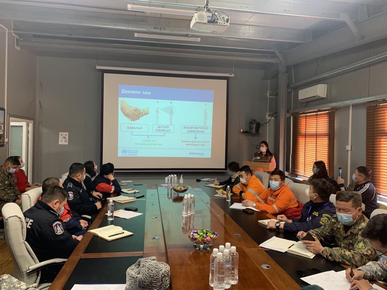- Ажлын хэсгээс Боомтын зөвлөл, Гурвантэс, Ноён сумдын онцгой комисс, сумын ЭМТ-ийн эмч, ажилтнууд, уул уурхайн компаниудын эмч, ХАБ-ын ажилтан 42 хүнийгкоронавируст халдварын талаарх ерөнхий ойлголт, халдварын сэргийлэлт, хяналт, тусгаарлан ажиглалтын журам, ажилтнуудын үүрэг чиглэл, зохион байгуулалтын талаарх сургалтанд хамрууллаа.