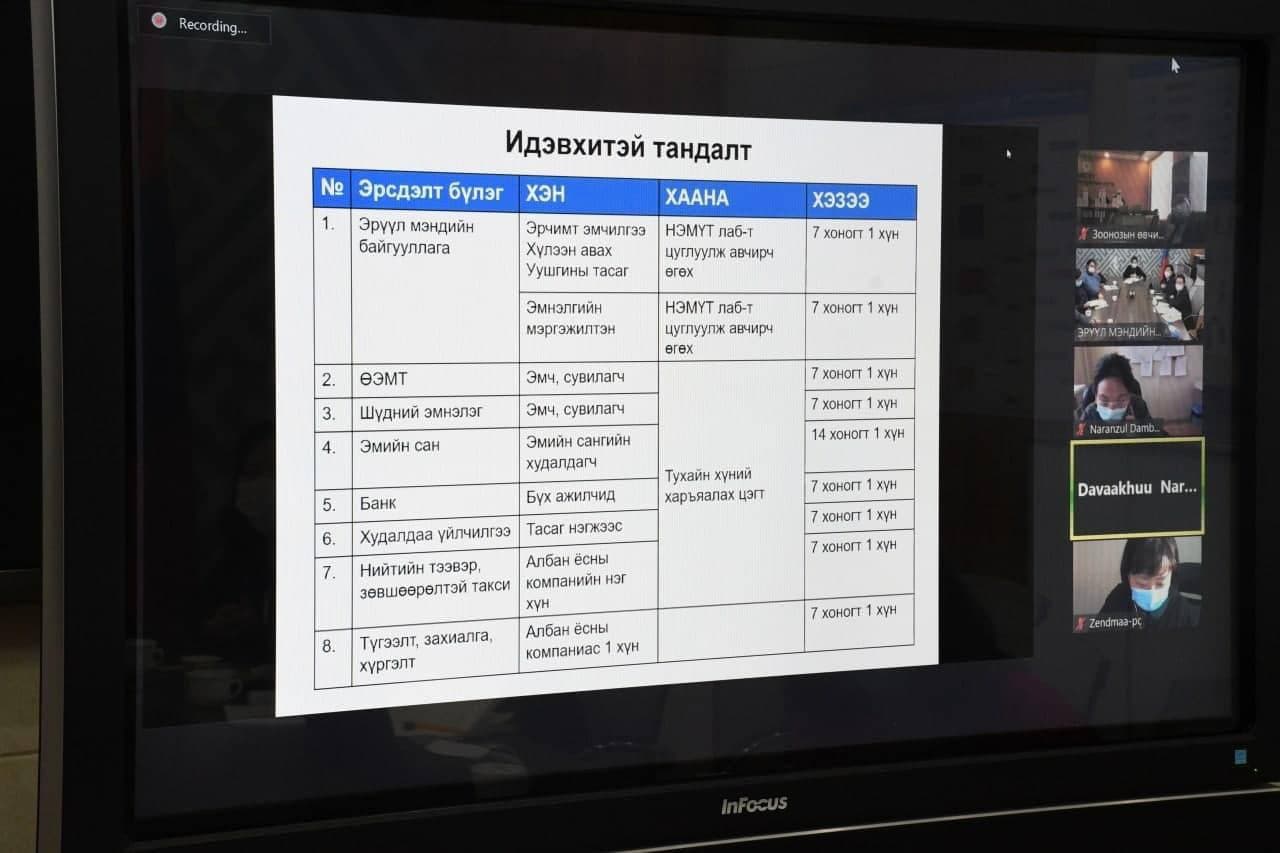 Хурлыг ЭМУА- ТУТ-ын орлогч дарга, Эрүүл мэндийн дэд сайд Ш.Анхмаа удирдан явуулж лабораториудын хүчин чадалд тулгуурлан идэвхитэй тандалтын төлөвлөлтийг нарийвчлан шинэчлэх, байгууллагад суурилсан эрсдэлийн үнэлгээг тогтмолжуулах, голомтод ажиллаж байгаа эрүүл мэндийн ажилтнуудын ажлын ачаалал, зохицуулалт дээр байгууллагын удирдлагууд анхаарч ажиллах, тандалтын үйл ажиллагааг уялдуулах чиглэлээр нэгдсэн зөвшилцөлд хүрч санал солилцлоо.