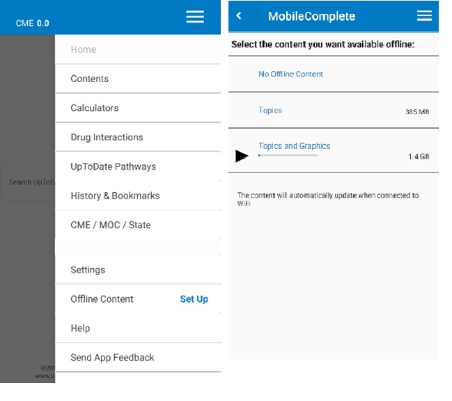 - Хэрэв интернэтийн сүлжээ хязгаарлагдмал нөхцөлд UpToDate системийг ашиглах бол Offline горимд хэрэглэхийн тулд Settings – Offline Content цэсээр орж 1,8GB хэмжээтэй өгөгдлийг татаж авах шаардлагатай. Татаж авахын өмнө өөрийн төхөөрөмж дээрх сул зай, дата-гийн хэмжээг тооцоолно уу.