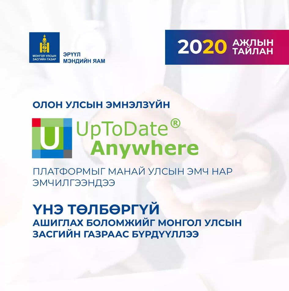 Дэлхийн өндөр хөгжилтэй орнуудын бүхий л эмнэл зүйн удирдамжуудыг нэгтгэсэн “Up-To-Date” нэртэй цахим платформыг манай улсын бүх шатны эмч мэргэжилтнүүд үнэгүй ашиглах боломжийг бүрдүүллээ. Үүний үр дүнд энэхүү цахим платформд байх удирдамжийг эмч нар эмнэл зүйн шийдвэр гаргахдаа ашиглах, олон улсын сайн туршлагыг оношилгоо, эмчилгээндээ нэвтрүүлэх, эрүүл мэндийн байгууллага, эмч нарын оношилгоо, эмчилгээний арга барилын зөрүүтэй байдал буурах, эмнэлгийн тусламж, үйлчилгээний чанар, аюулгүй байдал сайжрах боломж бүрдэж байна.