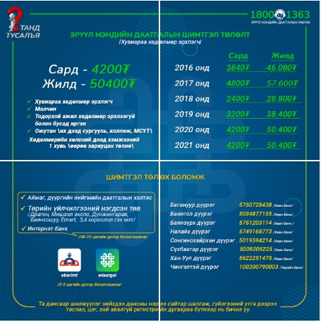 - Эрүүл мэндийн даатгалын тухай хуулиар иргэн бүр эрүүл мэндийн албан журмын даатгалд заавал даатгуулах үүрэгтэй. Албан журмын даатгал нь даатгуулагчийн төлсөн шимтгэлийн хэмжээнээс үл хамааран эрүүл мэндийн улмаас учирч болзошгүй санхүүгийн эрсдэлийг хуваалцах эв санааны нэгдлийн зарчимд тулгуурладаг.