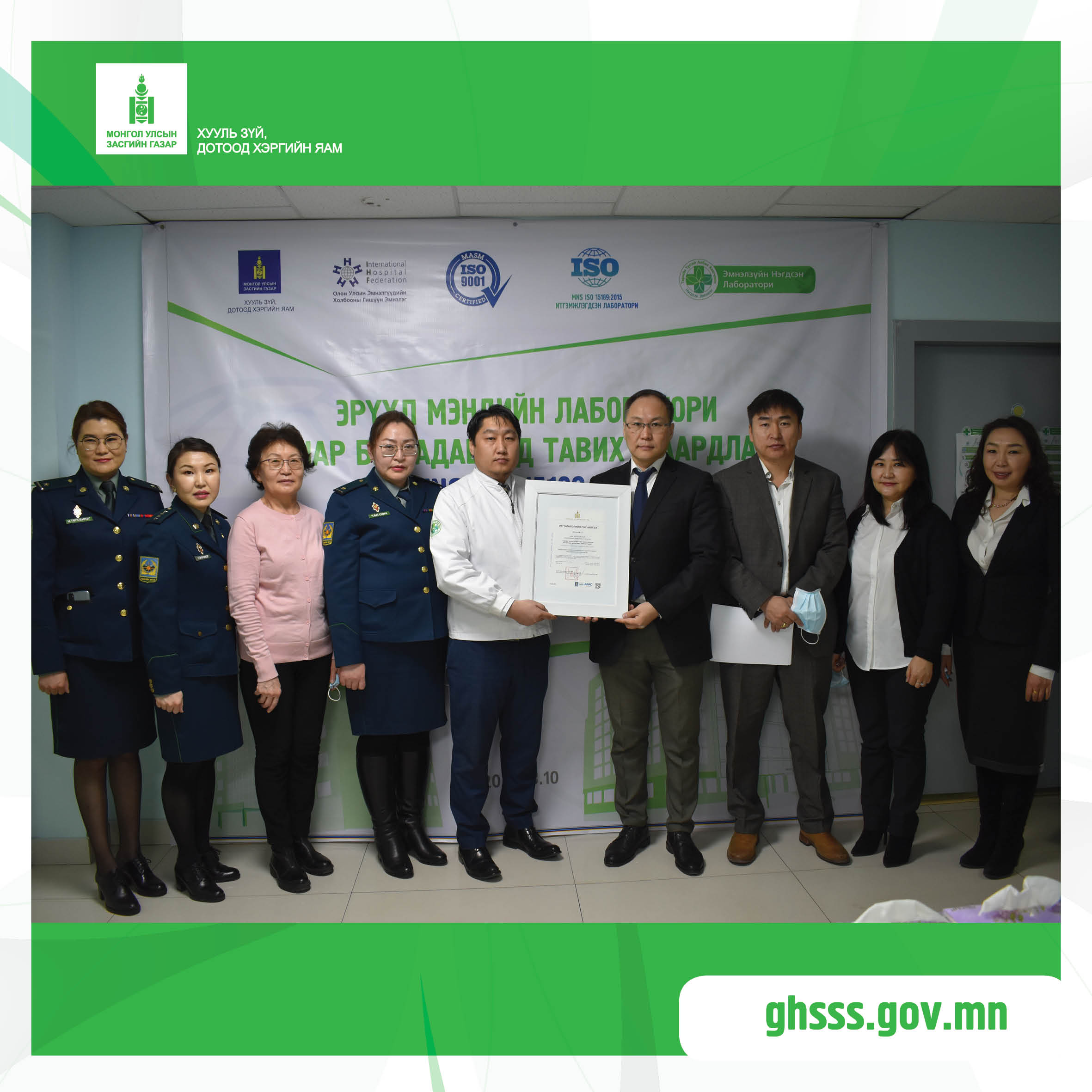 2021 оны 03 дугаар сарын 10-ны өдөрТөрийн Тусгай Албан Хаагчдын Нэгдсэн эмнэлгийн Эмнэлзүйн нэгдсэн лаборатори нь “Эрүүл мэндийн лабораторийн чанар ба чадавхид тавих шаардлага” MNS ISO 15189:2015 стандартыг үйл ажиллагаандаа нэвтрүүлэн “Итгэмжлэгдсэн лабораторийн гэрчилгээ”-гээ гардан авлаа.