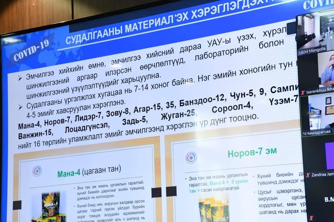 Эрүүл мэндийн сайд С.Энхболд Эрүүл мэндийн яамны шинжлэх ухаан технологийн зөвлөлтэй цахимаар хуралдлаа. Хурлаар Монгол улсад хэрэгжиж байгаа коронавируст халдвар (COVID-19)-ын судалгааны ажлуудын явц, үр дүн цаашид хэрэгжүүлэх судалгааны төслүүдтэй танилцлаа. Судалгааны төслүүдээс COVID-19-ийн үед Монголын уламжлалт анагаах ухааны эмүүдийн эмнэлзүйн судалгаа болон Коронавируст халдвар (COVID-19)-ын Вакцин үйлдвэрлэх зэрэг сонирхол татахуйц олон төсөл танилцуулагдсан юм.