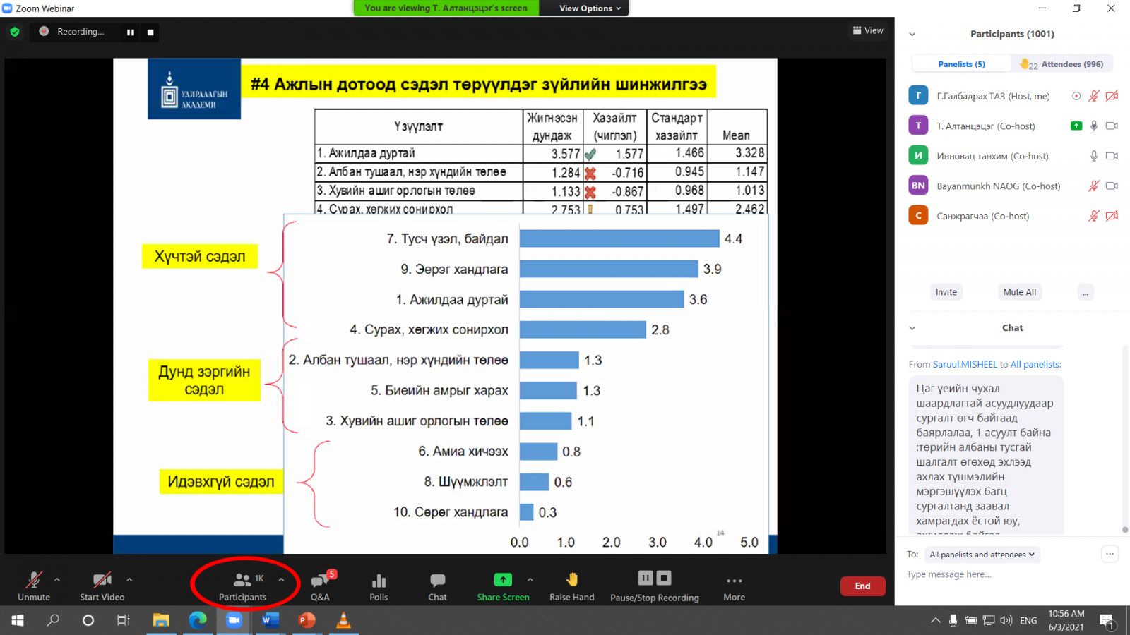 Сургалтын сэдвийг хэрэгцээнд тулгуурлан тодорхойлох үүднээс судалгаа явуулахад төрийн байгууллагад зан үйлийн менежментийг нэвтрүүлэх, цахим хэрэглээний ёс зүй, нууцлалын асуудал, цахим хэрэглээний нөлөө, ажлын байрны эрүүл мэнд болон сэтгэл зүй, харилцааны сургалтыг илүүд тооцжээ.