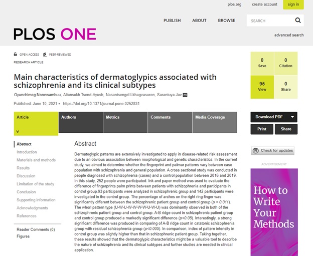 Сэтгэцийн Эрүүл Мэндийн Үндэсний Төв, Анагаахын Шинжлэх Ухааны Үндэсний Их Сургуулийн эмч, эрдэмтэдийн хамтран бүтээсэн “Шизофрени эмгэг ба түүний эмнэлзүйн хэлбэрүүдийн үед тохиолдох дерматоглификийн гол шинжүүд” сэдэвт судалгааны ажил нь Олон улсын нэр хүнд бүхий Эрдэм шинжилгээний сэтгүүл болох Public Library of Science (Plos one ) IF-2.740 (2019-2020) сэтгүүлд хэвлэгдлээ. Энэхүү Plos one эрдэм шинжилгээний сэтгүүл нь 200 гаруй судалгааны чиглэлээр дэлхийн 20000 гаруй судлаач нарыг холбосон эрдэм судлалын нотолгоо, шаардлага, ёс зүй өндөртэй сэтгүүл юм.Судлаач Н.Оюунчимэг, Ц.Алтансүх, Л.Насанцэнгэл, Ж.Сарантуяа нарын судалгаагаар шизофрени эмгэгтэй хүмүүс болон нийт хүн амын дунд хуруу болон алганы хээнд ялгаа байгаа эсэхийг тодорхойлохыг зорьсон.