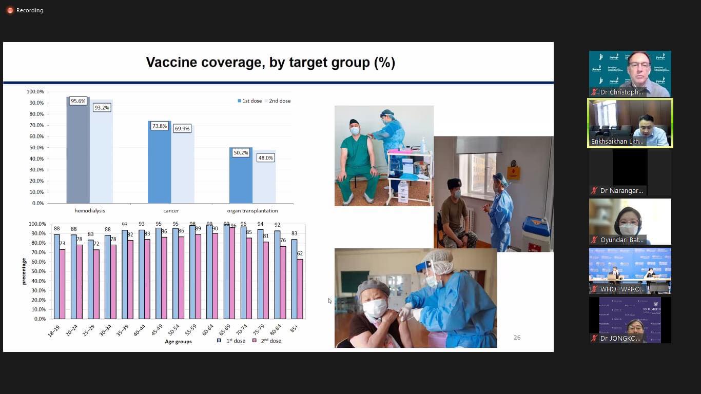 ДЭМБ-ын Номхон далайн баруун бүсийн “Дархлаажуулалт, тарилгатай халдварт өвчний тандалтын 30 дахь удаагийн хурал”-ын 2 дахь өдөр ийнхүү зохион байгуулагдаж байна. Цар тахлын эсрэг бүс нутгийн дархлаажуулалтын явц, хариу арга хэмжээний талаар хуралд хэлэлцлээ. Дархлаажуулалтын хөтөлбөр 2030, COVID-19 цар тахлын эсрэг вакцинжуулалтын талаар дэлхий дахинд, бүс нутгийн хэмжээнд хэрэгжүүлж буй арга хэмжээг хэлэлцэж, Монгол улсад Коронавируст халдвар (КОВИД-19)-ын эсрэг вакцинжуулалтын явц, туршлагыг танилцуулсан юм.