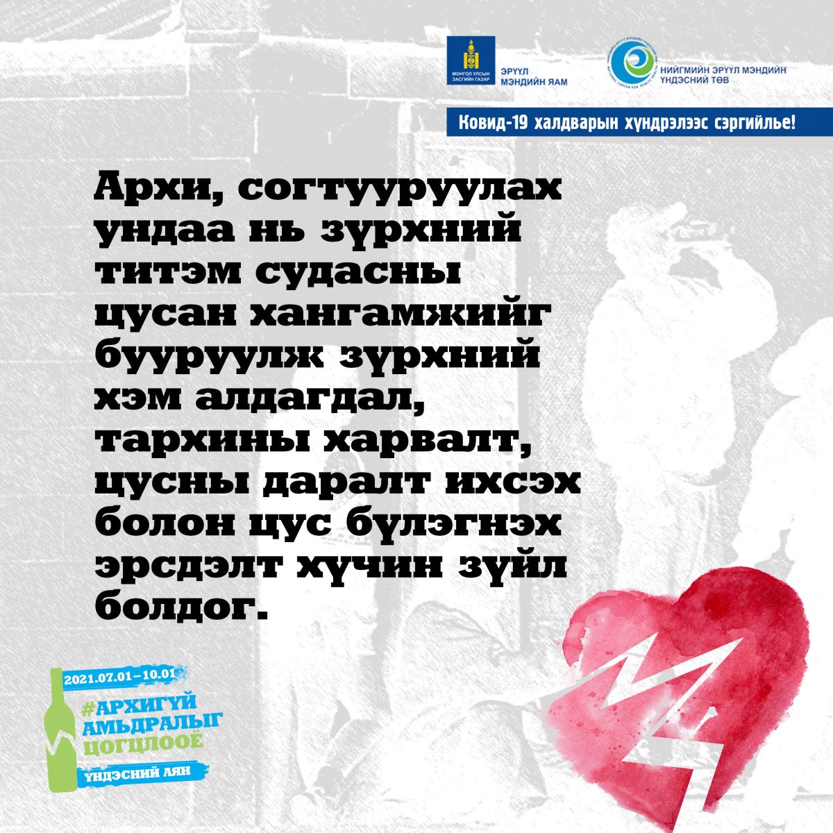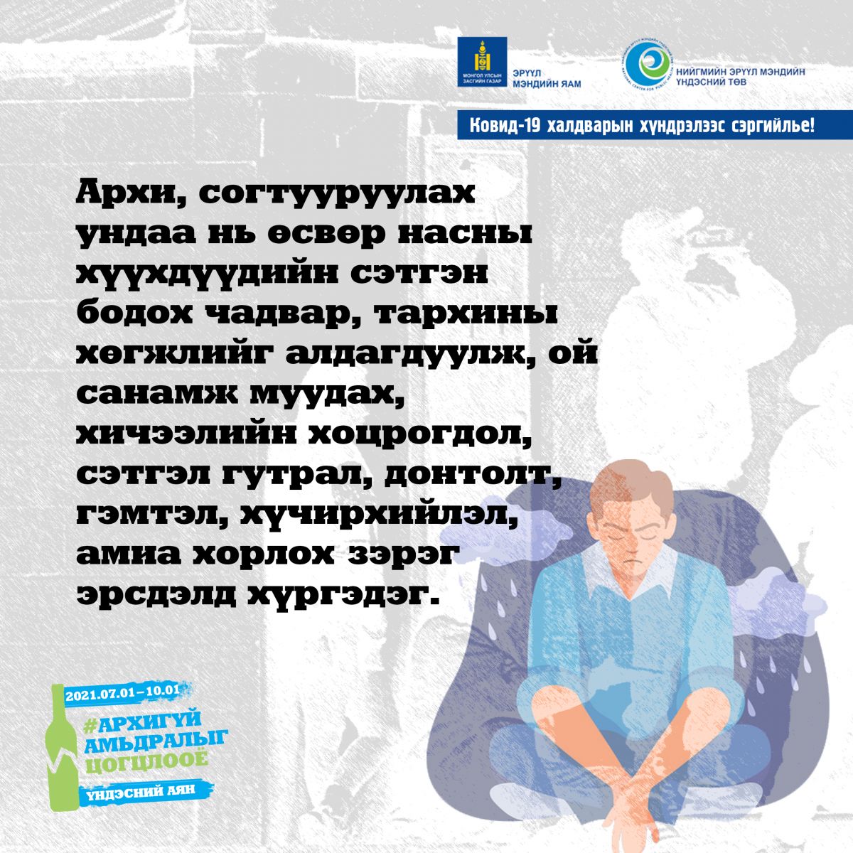 Архи, согтууруулах ундааны хэрэглээг бууруулах, эрүүл мэнд, эдийн засагт нөлөөлөх сөрөг үр дагаврыг таниулах, аймаг, орон нутгийн иргэдийн эрүүл мэндийн боловсролыг дээшлүүлэх зорилгоор 2021 оны 7 дугаар сарын 1-нээс 10 дугаар сарын 1-ний хооронд “Архигүй амьдралыг цогцлооё” аян үргэлжилж байна. Аяны хүрээнд 2021 оны 07 дугаар сарын 05-ны өдөр Аймаг, Нийслэлийн Халдварт бус өвчний асуудал хариуцсан мэргэжилтэн, СӨЭМТ-ийн төвүүдийн эмч, нийгмийн эрүүл мэндийн ажилтнуудыг чадавхижуулах цахим сургалт зохион байгуулагдсан.