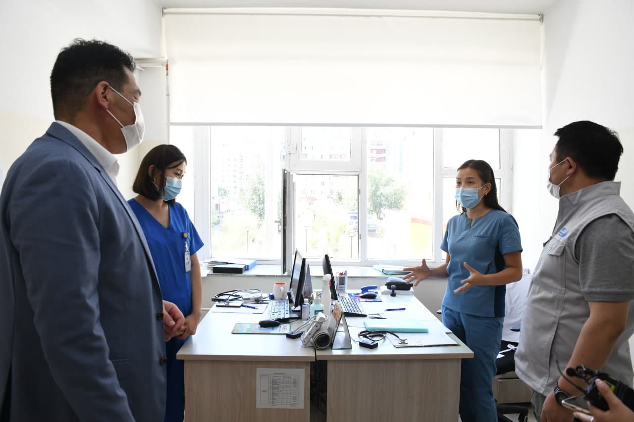 Эрүүл мэндийн сайд С.Энхболд, ЭМЯ-ны Эмнэлгийн тусламжийн бодлого, хэрэгжилтийг зохицуулах газрын дарга Б.Буянтогтох нар “Цэдэн Эрдэнэ” өрхийн эрүүл мэндийн төвийн үйл ажиллагаатай танилцав. Цар тахлын үед анхан шатны нэгж болох өрхийн эмнэлгүүдийн ачаалал маш их байгаа билээ. БЗД-ийн 15-р хороо нийт 7644 хүн амтайгаас “Цэдэн Эрдэнэ” өрхийн эрүүл мэндийн төв өнөөдрийн байдлаар 50 хүний гэрийн ажиглалт хяналтыг хийж байна. Өрхийн эмч Г.Нямжаргал архаг хууч өвчтэй, 50-аас дээш насны хүмүүс илүү ковидын хүндрэлээр хүндэрч байгааг онцлов. Түүнчлэн 0-18 насны хүүхдүүдийн 20 хувь нь өвчилсөн гэлээ. “Цэдэн Эрдэнэ” өрхийн эрүүл мэндийн төв нь их эмч 4, сувилагч 4, туслах сувилагч 1, нийгмийн ажилтан 1 зэрэг нийт 10 хүний бүрэлдэхүүнтэй ажиллаж байна.
