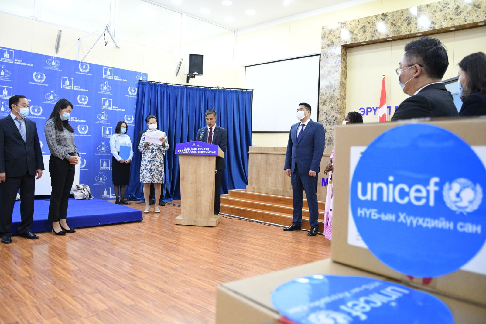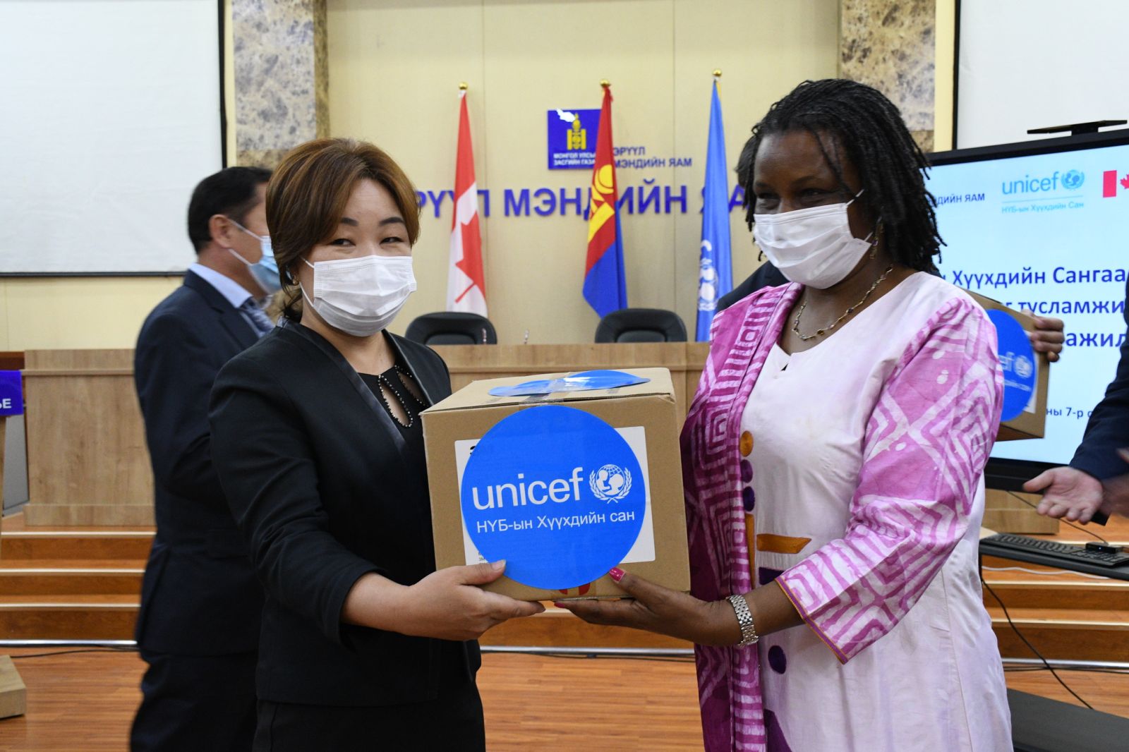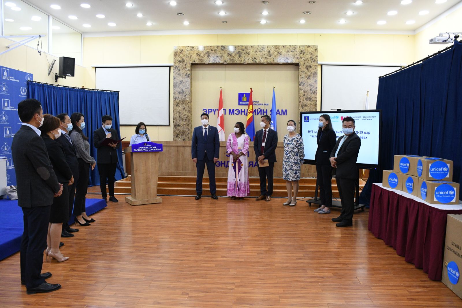 Нэгдсэн Үндэстний Байгууллагын “КОВИД-19 халдвартай тэмцэх эм, эмчилгээний тоног төхөөрөмж, хэрэгслийн хангамжийг дэмжих АСТ-А“ механизмын санхүүжилтийн хүрээнд олгосон эмнэлгийн тоног төхөөрөмж, эм, хэрэгслийг хүлээлцэх арга хэмжээ өнөөдөр Эрүүл мэндийн яаманд зохион байгуулагдав. Арга хэмжээнд Засгийн газрын гишүүн, Эрүүл мэндийн сайд С.Энхболд, Канад Улсын Элчин сайдын яамны Элчин эөвлөх, Хөгжлийн хөтөлбөрийн тэргүүн Гленн Зизански, НҮБ-ын Хүүхдийн Сангийн Шадар суурин төлөөлөгч Спесиоз Хакизимана болон бусад албаны хүмүүс оролцлоо.
