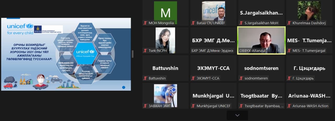 Цахим хуралдаанд ЭМЯ, түүний харьяа үндэсний төв, аймаг, нийслэл, дүүргийн ЭМГ, Орчны бохирдлыг бууруулах үндэсний хорооны төлөөлөл болон 50 гаруй эмч, эмнэлгийн мэргэжилтэн оролцсон бөгөөд хуралдааныг нээж Эрүүл мэндийн дэд сайд М.Баттүвшин хэлсэн үгэндээ цар тахлын үеийн амаргүй нөхцөл байдлыг даван туулахад НҮБ-ын Хүүхдийн Сангийн үзүүлсэн туслалцааг өндрөөр үнэлж, нэн шаардлагатай эм, эмнэлгийн тоног төхөөрөмж, аминдэм, хоол тэжээлийн бэлдмэл, хувийн хамгаалах хувцас, хэрэгслэлээр хангах, хүйтэн хэлхээний тоног төхөөрөмжийг бүрэн шинэчлэх, хүчилтөрөгчийн дагалдах хэрэгслэл, вакцин, био-бэлдмэлийн үндэсний төв агуулахын барилгын ажлыг богино хугацаанд чанар, стандартын өндөр шаардлага хангахуйц түвшинд гүйцэтгэж, хүлээлгэн өгсөнд талархалаа илэрхийлэв. Тэрээр Эрүүл мэндийн бүх нийтийн хамралтыг бий болгох чиглэлээр эх, хүүхдийн эрүүл мэндийн хөтөлбөр, хоол тэжээлийн хөтөлбөр, ус хангамж, ариун цэврийн байгууламжийн хөтөлбөр, агаарын бохирдол, уур амьсгалын өөрчлөлтийн нөлөөллийг бууруулах хөтөлбөр, коронавируст халдвар (КОВИД-19)-ын вакцинжуулалтын хөтөлбөрийн хүрээнд гарсан ахиц дэвшлийг дурдаад цаашид анхаарах асуудлуудаар санал бодлоо чөлөөтэй илэрхийлэхийг нийт оролцогчдоос хүсэв.