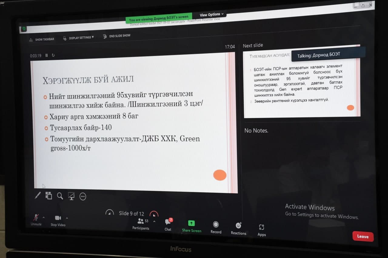 Эрүүл мэндийн яамнаас орон нутагт халдварын нөхцөл байдал хүндэрч байгаатай холбогдуулан орон нутгийн Эрүүл мэндийн байгууллагуудтай цахим хурал зохион байгуулав. Тус хуралд Нийтийн эрүүл мэндийн тусламж, бодлого хэрэгжилтийг зохицуулах газрын дарга Л.Энхсайхан, Эмнэлгийн бодлого, хэрэгжилтийг зохицуулах газрын дарга Б.Буянтогтох, ХӨСҮТ-ийн Халдварт өвчний тандалт судалгааны албаны дарга Ж.Нямсүрэн нар болон орон нутгийн мэргэжилтнүүд оролцов.