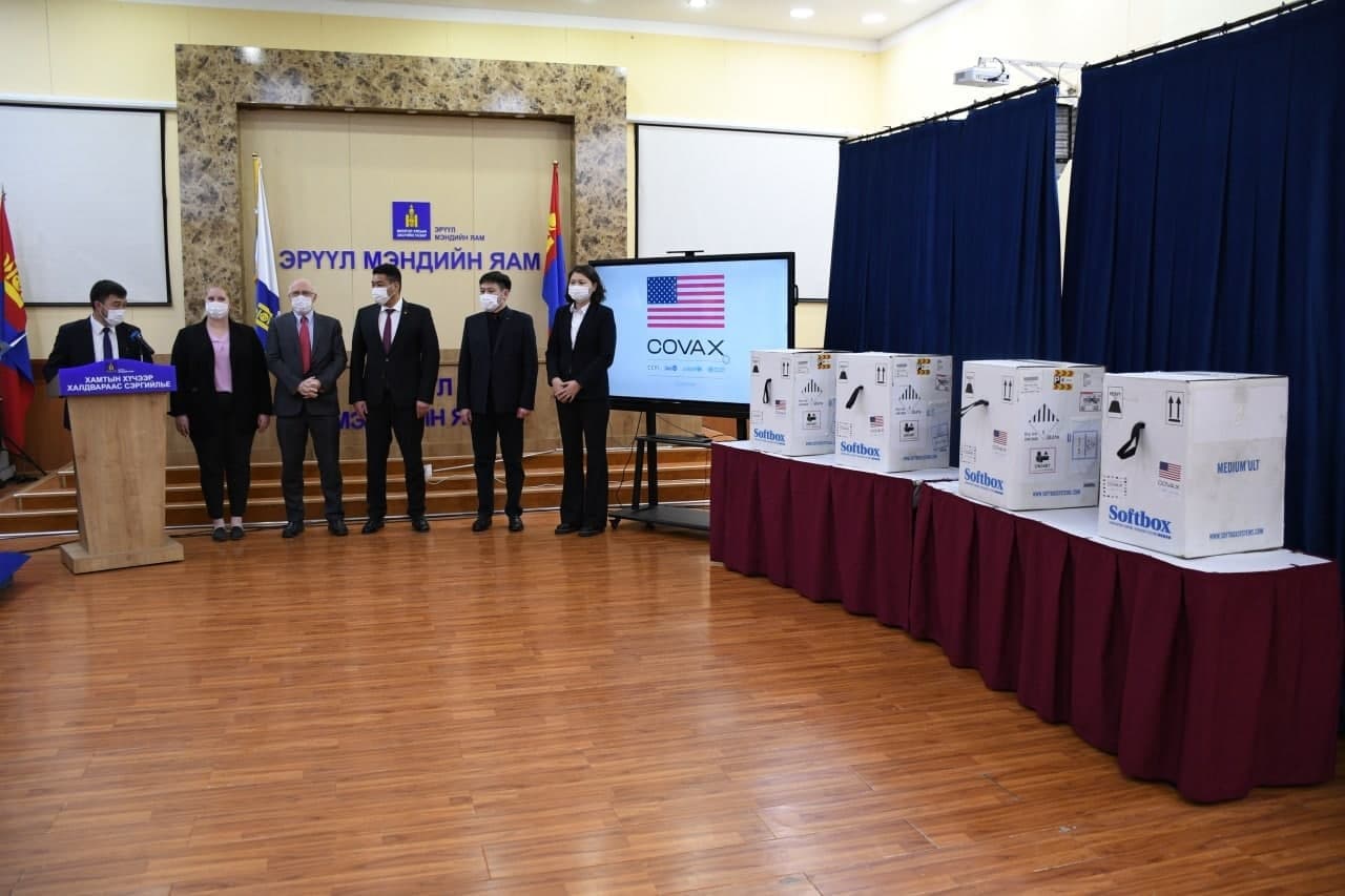 АНУ-ын Засгийн газраас КОВИД-19 халдварын эсрэг 899,730 тун Пфайзер вакцин хүлээлгэн өгөх арга хэмжээг өнөөдөр Эрүүл мэндийн яам дээр зохион байгууллаа. Тус улсын Засгийн газраас Монгол Улсын Засгийн газарт олгож буй тусламжийн хүрээнд 899,730 тун Пфайзер/БиоНТех BNT162 вакциныг Олон улсын вакцин хангамжийн КОВАКС хөтөлбөрөөр дамжуулан 2021 оны 10 дугаар сарын 6-ны өдөр хүлээн авсанаар нийт 1,100,000 тун Пфайзер вакциныг АНУ-ын Засгийн газраас хүлээн авлаа.