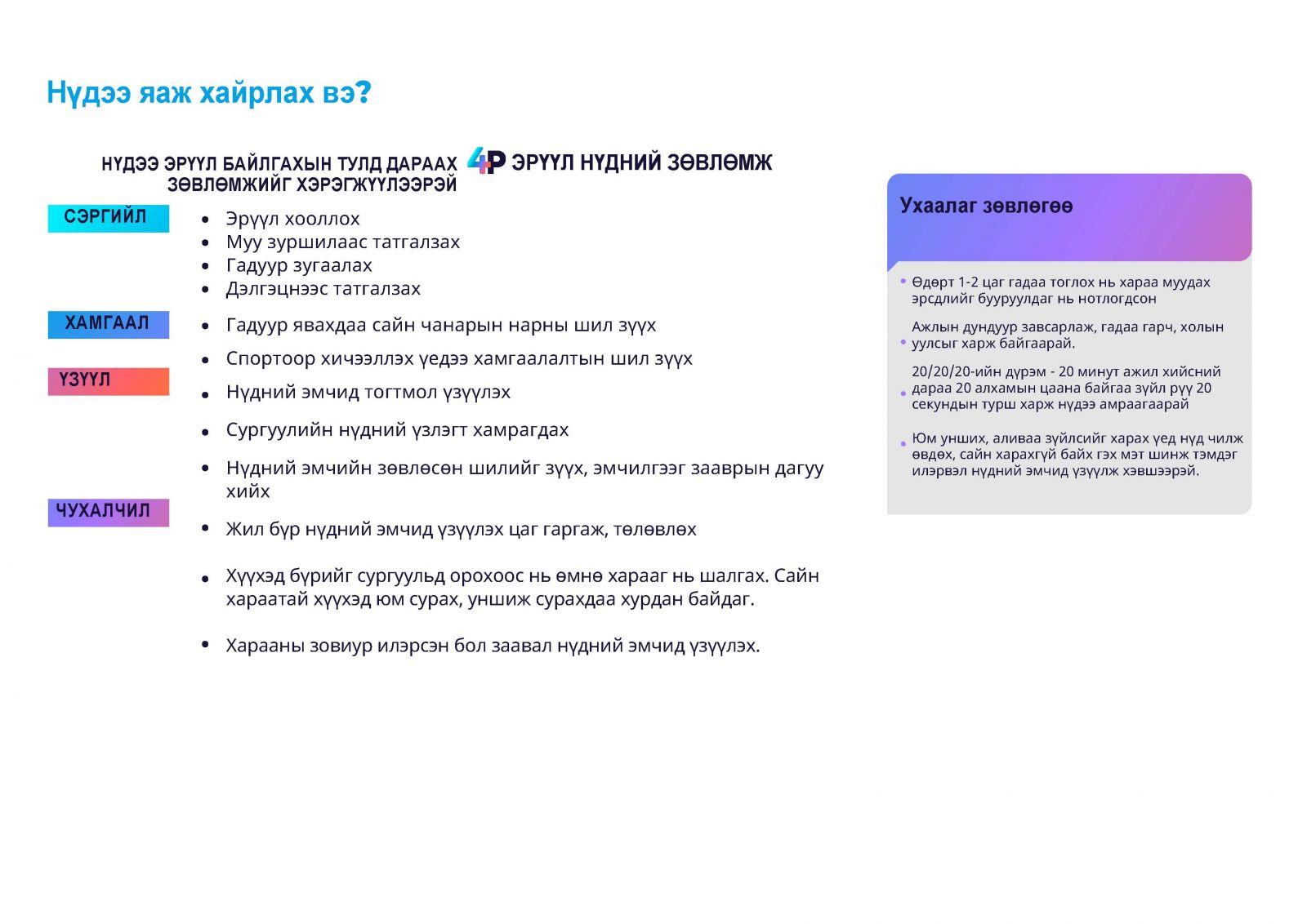 Хэрэв таны хараа муудаж байгаа бол, танай гэр бүлд нүдний даралт ихсэх өвчинтэй эсвэл чихрийн шижинтэй хүн байвал та жил бүр нүдний эмчид үзүүлэх шаардлагатй ба нүдээ хамгаалах зорилгоор нарны шил, саравчтай малгай өмсөж хэвшээрэй. Нүдний өвчнийг эрт оношилж, эмчилвэл сохролоос сэргийлэх бүрэн боломжтой. Та жилд 1 удаа заавал нүдний эмчид очиж, хараагаа шалгуулж байгаарай.