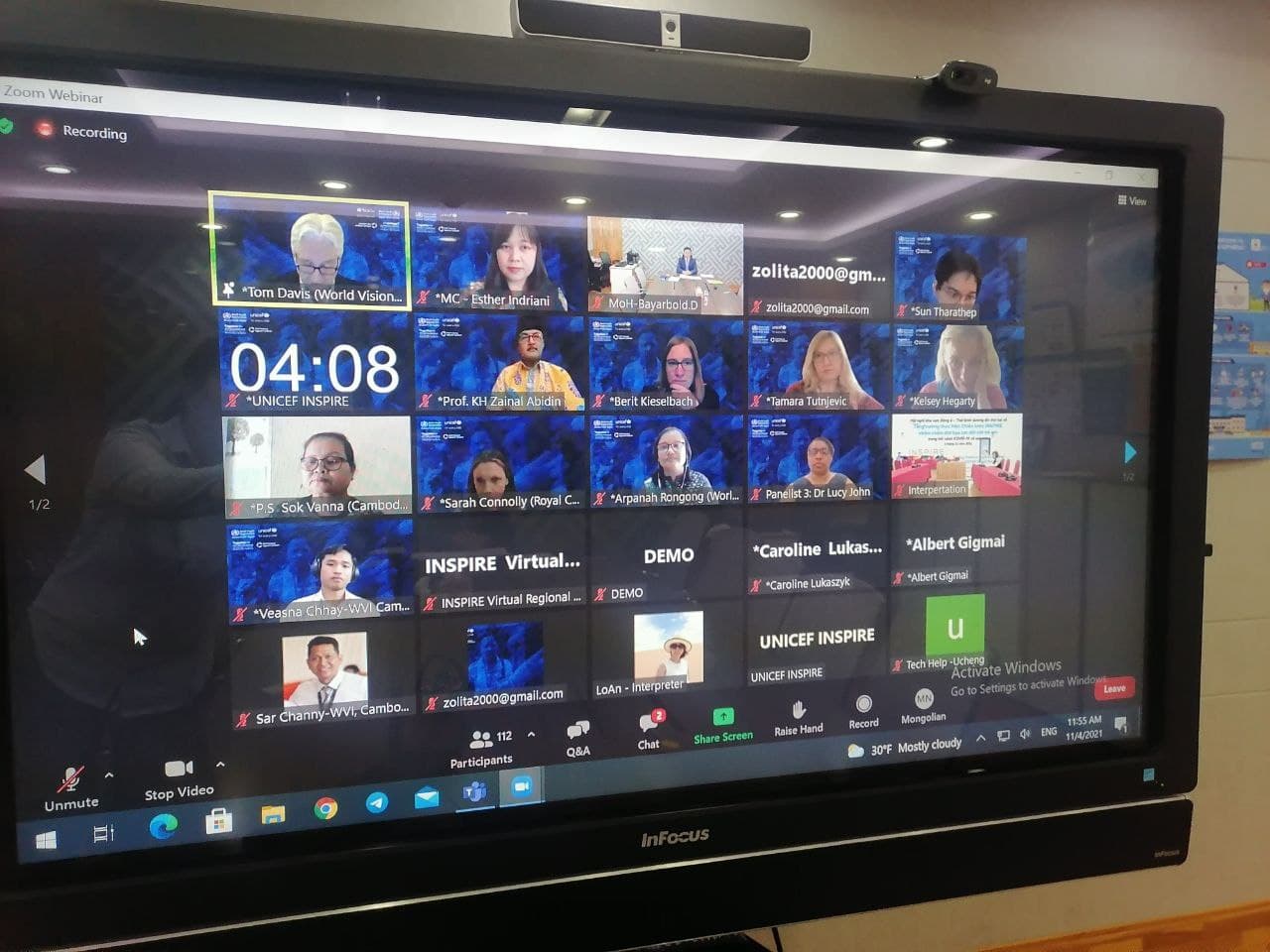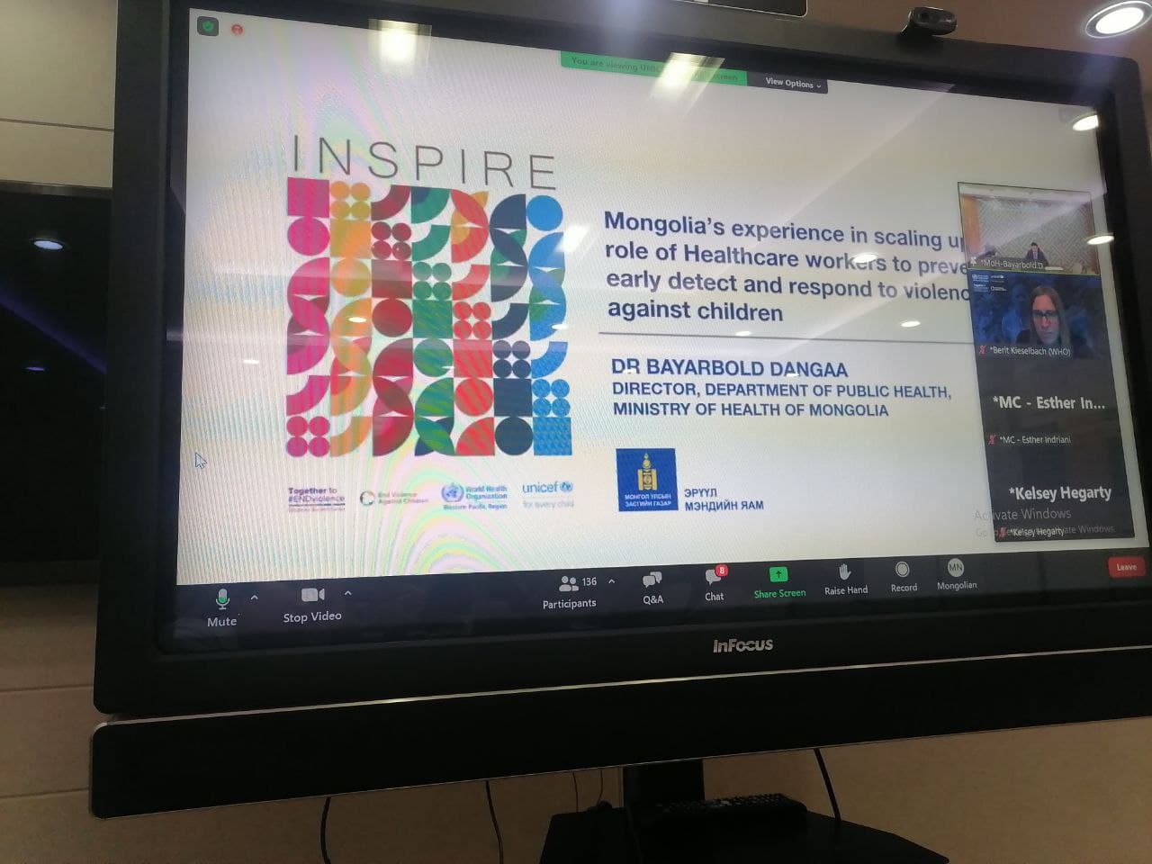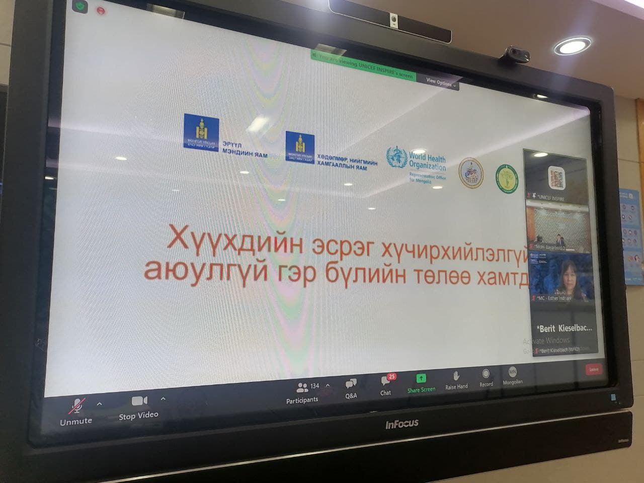 Дэлхийн Эрүүл Мэндийн Байгууллага, НҮБ-ын Хүүхдийн сан хамтран 2021 оны 11 дүгээр сарын 01-05-ны өдрүүдэд зохион байгуулж буй "КОВИД-19 ЦАР ТАХЛЫН ҮЕД INSPIRE СТРАТЕГИЙН ХЭРЭГЖИЛТИЙГ ЭРЧИМЖҮҮЛЖ, ХҮҮХДИЙН ЭСРЭГ ХҮЧИРХИЙЛЛИЙГ ТАСЛАН ЗОГСООХ НЬ" сэдэвт бүсийн цахим бага хурал амжилттай зохион байгуулагдлаа.