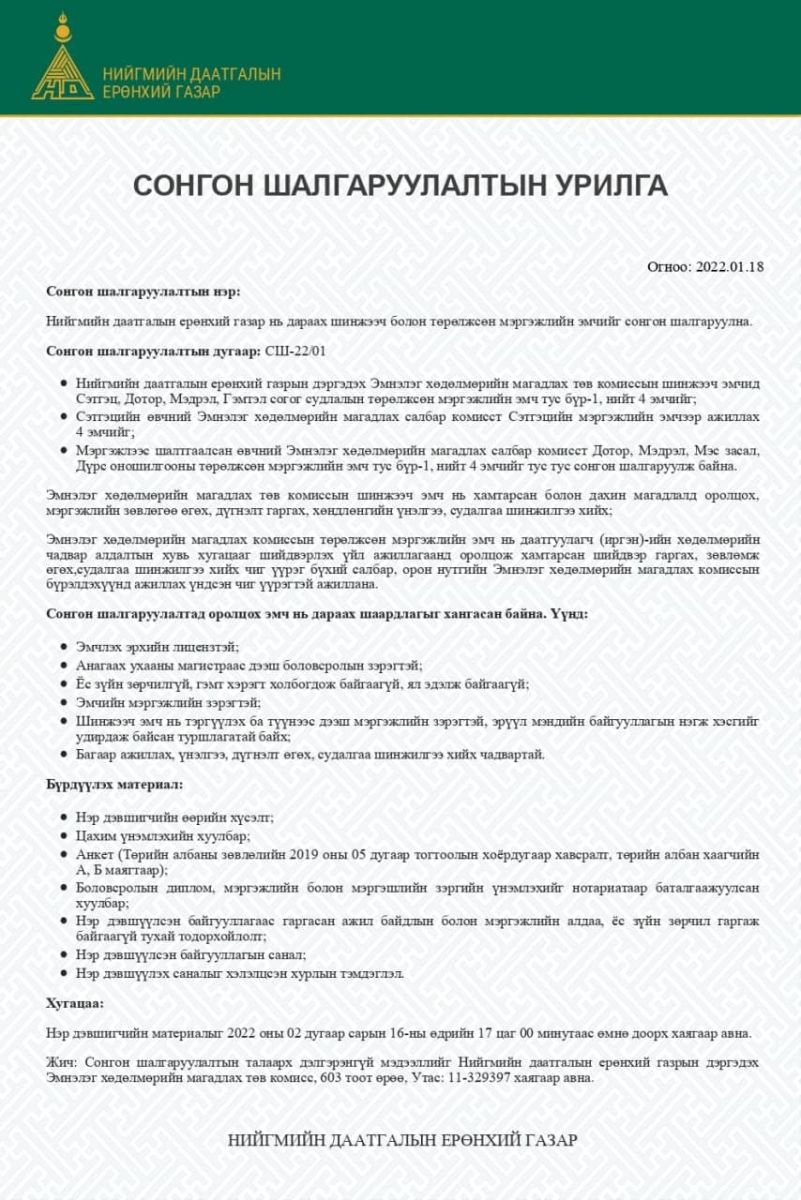 ЭРҮҮЛ МЭНДИЙН ЯАМНЫ ГҮЙЦЭТГЭХ АЛБАН ТУШААЛ /Ахлах түшмэл/