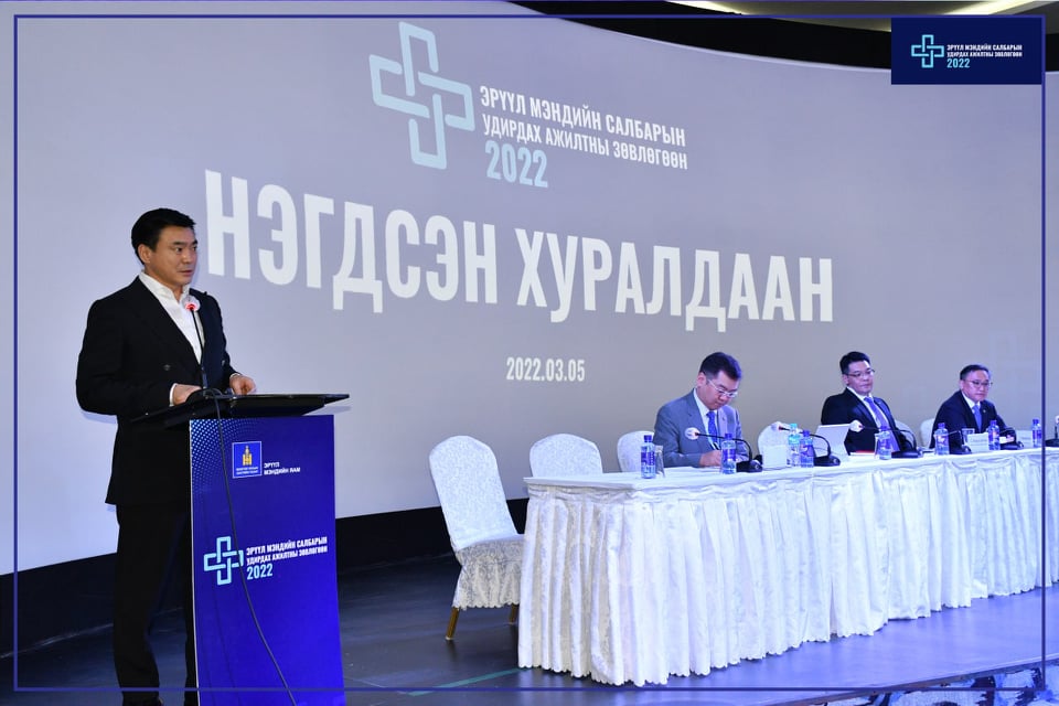 Дэлхий дахинаа цар тахал хэлбэрээр дэгдсэн Коронавируст халдвар (КОВИД-19)-ын халдварын улмаас үүссэн нөхцөл байдалтай уялдуулан жил бүр уламжлал болгон зохион байгуулагддаг Эрүүл мэндийн салбарын удирдах ажилтны зөвлөгөөнөө сүүлийн 2 жил алгасч энэ ондоо зохион байгуулж байна. КОВИД-19 халдварын эсрэг хариу арга хэмжээний чадавхыг нэмэгдүүлэх зорилгоор 2020-2021 онд эрүүл мэндийн салбарын төсөв, техник, тоног төхөөрөмжийн хөрөнгө оруулалт нэмэгдэхийн зэрэгцээ салбарын үйл ажиллагааг оновчтой зохион байгуулах шинэчлэлийн зорилтот арга хэмжээг ч бид амжилттай хэрэгжүүлэв. Тухайлбал, салбарын санхүүжилтийн шинэчлэлийн хүрээнд нийт эрүүл мэндийн байгууллагуудад гүйцэтгэлийн санхүүжилтийг нэвтрүүлж салбарын санхүүжилтийн үр ашиг, үр нөлөөг сайжруулах алхмыг эхлүүлэхийн зэрэгцээ салбарын цахим шилжилтийг эрчимжүүлж нийт 10 гаруй төрлийн тусламж үйлчилгээг иргэдэд хүлээгдэл, чирэгдэлгүйгээр цахимаар үзүүлэх боломжийг бүрдүүлсэн юм.