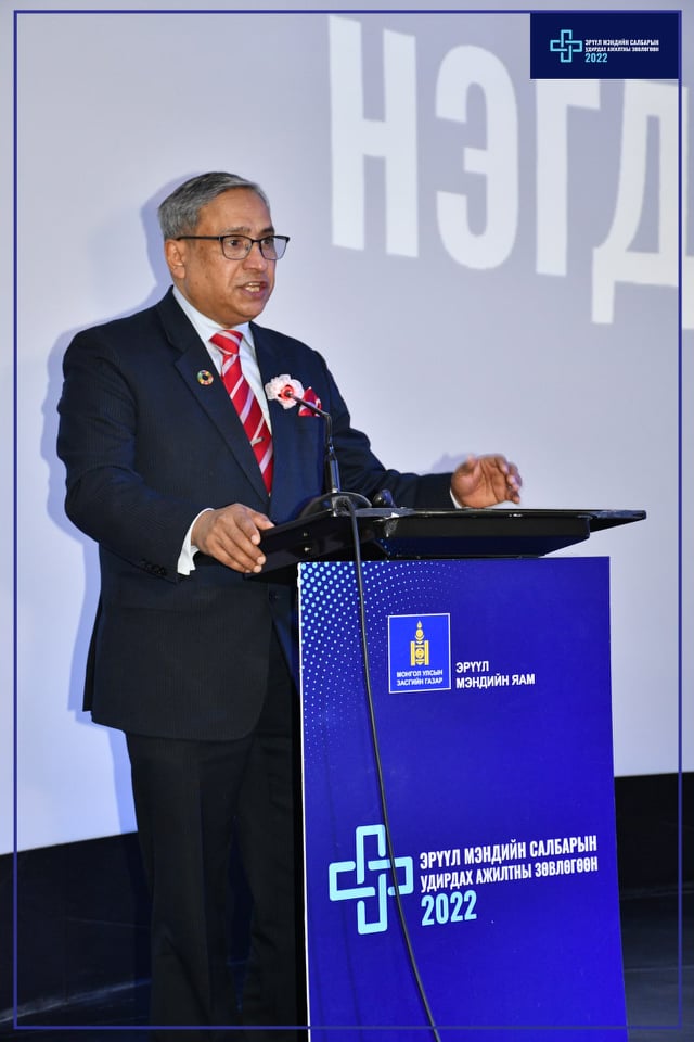 Энэ үеэр Эрүүл мэндийн сайд С.Энхболд: “Коронавируст халдвар (КОВИД-19)ын цар тахал нь бүх дэлхийн улс орнуудад хүний эрүүл мэнд хэчнээн чухал болохыг харуулахын зэрэгцээ улс орны хөгжлийн гол хөдөлгөгч хүч нь “ЭРҮҮЛ ХҮН-ЭРҮҮЛ ИРГЭН” болохыг нотлон харуулсан. Энэ хэцүү цаг үед юуны өмнө төр засгийн оновчтой шийдвэр, салбар дундын хамтын ажиллагаа ихээхэн чухал байж үүссэн нөхцөл байдлыг хамтын хүчээр НЭГДМЭЛ НЭГ ЗОРИЛГОТОЙГООР даван туулахад томоохон сорилт болсон он жилүүд байлаа. Энэхүү сорилтыг амжилттай даван туулахад “Эрүүл мэндийн салбарын манлайлал тэр дундаа эрүүл мэндийн байгууллагын удирдах ажилтнууд, эрдэмтэн багш нар, эрүүл мэндийн ажилтнууд та бүхний хичээл зүтгэл өндөр байсныг энд цохон тэмдэглэхийн сацуу байнгын дэмжлэг туслалцаа үзүүлж хамтран ажилласан НҮБ, НҮБХС, ДЭМБ, Дэлхийн банк, Азийн хөгжлийн банк, Глобаль сан, Швейцарийн хөгжлийн агентлаг, ЖАЙКА, КОЙКА зэрэг олон улсын байгууллагууд та бүхэндээ хувиасаа болон нийт Монголынхоо ард түмний нэрийн өмнөөс гүн талархалаа илэрхийлье” хэмээн хэлсэн үгэндээ онцлов.
