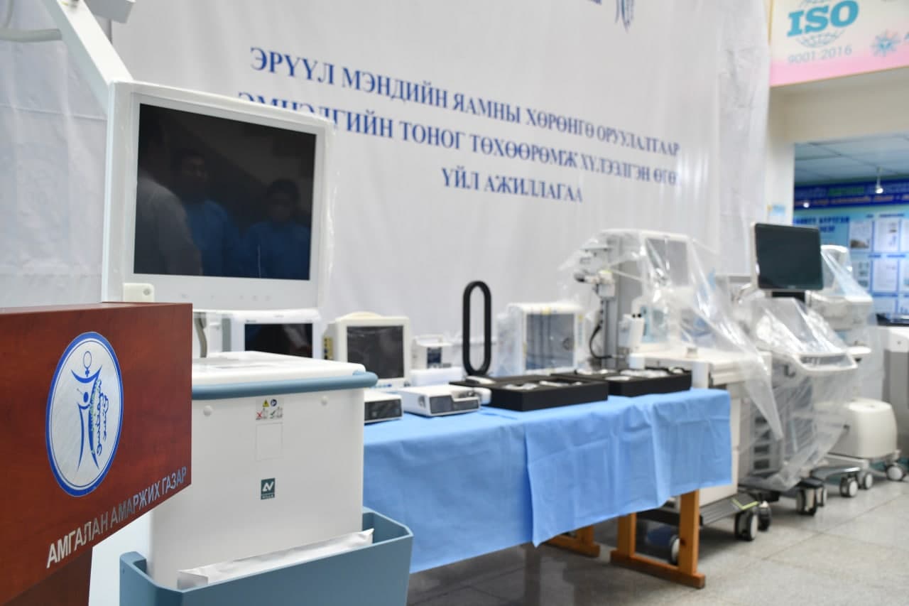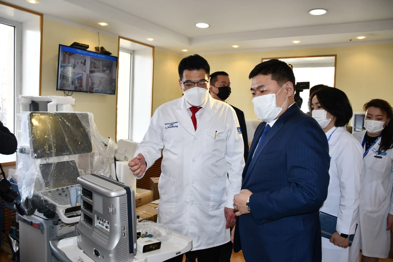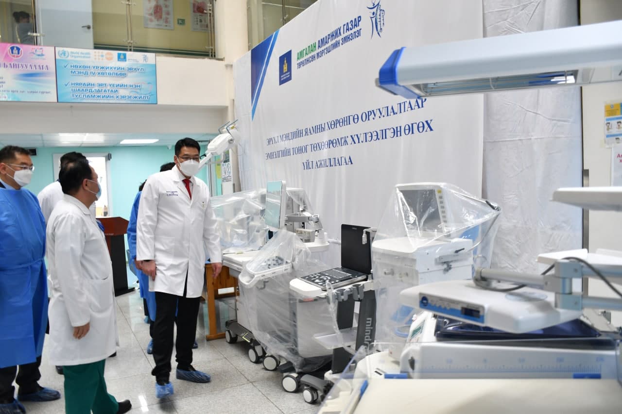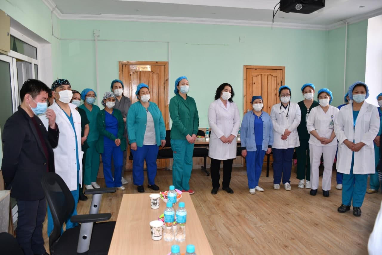 Эрүүл мэндийн сайд С.Энхболд, ЭМЯ-ны Төрийн нарийн бичгийн дарга Ц.Эрдэмбилэг, яамны удирдлагуудын хамт Өргөө, Хүрээ, Амгалан амаржих эмнэлгүүдэд ажиллаж шаардлагатай тоног төхөөрөмжүүдийг мөн гардуулж өглөө.