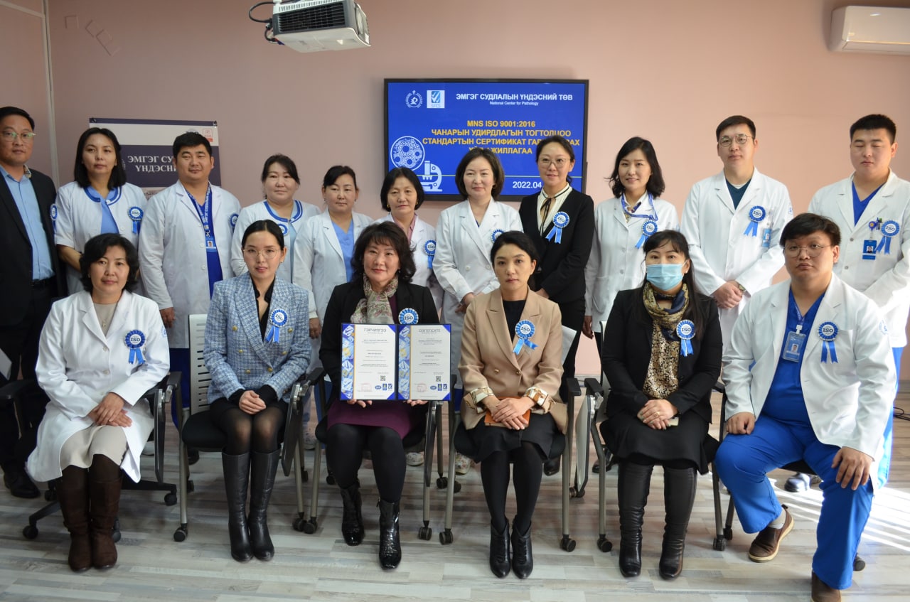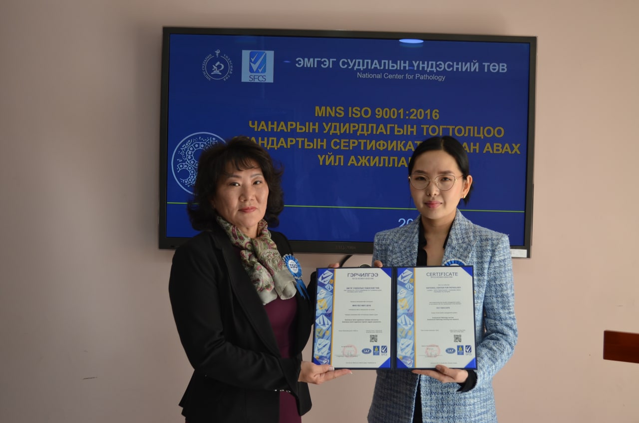 Эрүүл мэндийн яамны харьяа тусгай мэргэжлийн төв Эмгэг судлалын төв Чанарын менежментийн тогтолцоо ISO 9001:2015 олон улсын стандартыг үйл ажиллагаандаа нэвтрүүлж өнөөдөр хөндлөнгийн баталгаажуулалтын байгууллагаас сертификаа гардан авлаа. Уг арга хэмжээнд Эрүүл мэндийн яамны Эмнэлгийн тусламж, үйлчилгээний газрын дарга Ж.Нарангэрэл, хэлтсийн дарга Г.Навчаа, мэргэжилтэн Ц.Тунгалагтамир болон SFCS компаний гүйцэтгэх захирал Г.Ундарья, Эмгэг судлалын үндэсний төвийн захирал анагаах ухааны доктор, клиникийн профессор Г.Уянга, Чанарын удирдлагын хорооны гишүүд оролцлоо. Тус төв эмгэг судлалын тусламж үйлчилгээний чанар хүртээмжийг сайжруулах улмаар төрийн үйлчилгээг шат дамжлага багатай, хүнд сурталгүй хүргэх зорилгоор олон улсын чанарын менежментийн тогтолцоо нэвтрүүлэхээр стратегийн шийдвэр гаргаж 2021 оноос эхлэн үе шаттайгаар нэвтрүүлсэн юм.