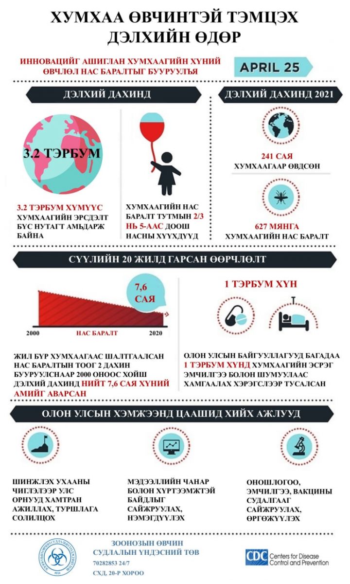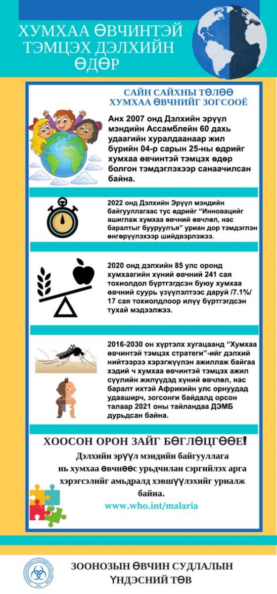 Хумхаа өвчин нь эгэл биет шимэгчээр үүсгэгддэг, Anopheles төрлийн шумуулаар дамжин халдварладаг, дахилттай халууралт, цус багадалт, элэг дэлүү томрох, арьс салст шарлах шинж тэмдгээр голчлон илэрдэг зоонозын хурц халдварт өвчин. Дэлхийн Эрүүл мэндийн байгууллагын 2015 оны мэдээгээр дэлхийн 90 гаруй улс оронд хумхаа өвчнийг дамжуулагч шумуул тархаж, дэлхийн хүн амын тэн хагас нь хумхаагийн эрсдэлт нутагт амьдарч, 224 сая тохиолдол бүртгэгджээ. 2007 оноос хойш жил бүрийн 4 дүгээр сарын 25-ны өдрийг хумхаа өвчинтэй тэмцэх өдөр болгон Дэлхий нийтээрээ тэмдэглэж ирсэн. 2022 онд Дэлхийн Эрүүл мэндийн байгууллагаас тус өдрийг “Инновацийг ашиглаж хумхаа өвчний өвчлөл, нас баралтыг бууруулая” уриан дор тэмдэглэн өнгөрүүлэхээр шийдвэрлэсэн. Монгол оронд хумхаагийн халдвар дамжуулагч шумуул тархсан, халдварын эрсдэл үүсч болзошгүй талаар зарим судлаачид тэмдэглэсэн байдаг. 2009-2021 онд хумхаагийн өвчний 17 зөөвөрлөгдсөн тохиолдол, 1 нас баралт бүртгэгдсэн нь хумхаагийн голомтот нутаг болох Энэтхэг, Солонгос улсад сурч, ажиллаж, амьдардаг, аялсан зорчсон, Африкын бүс нутгийн Конго, Мали, Нигери, Сьерра-Леоне, Кот-Дивуар, Гана, Судан улсад энхийг сахиулах ажиллагаанд болон ашигт малтмал, газрын тос олборлох үйл ажиллагаанд оролцсон, шумуулд хазуулсан өгүүлэмжтэй байсан.