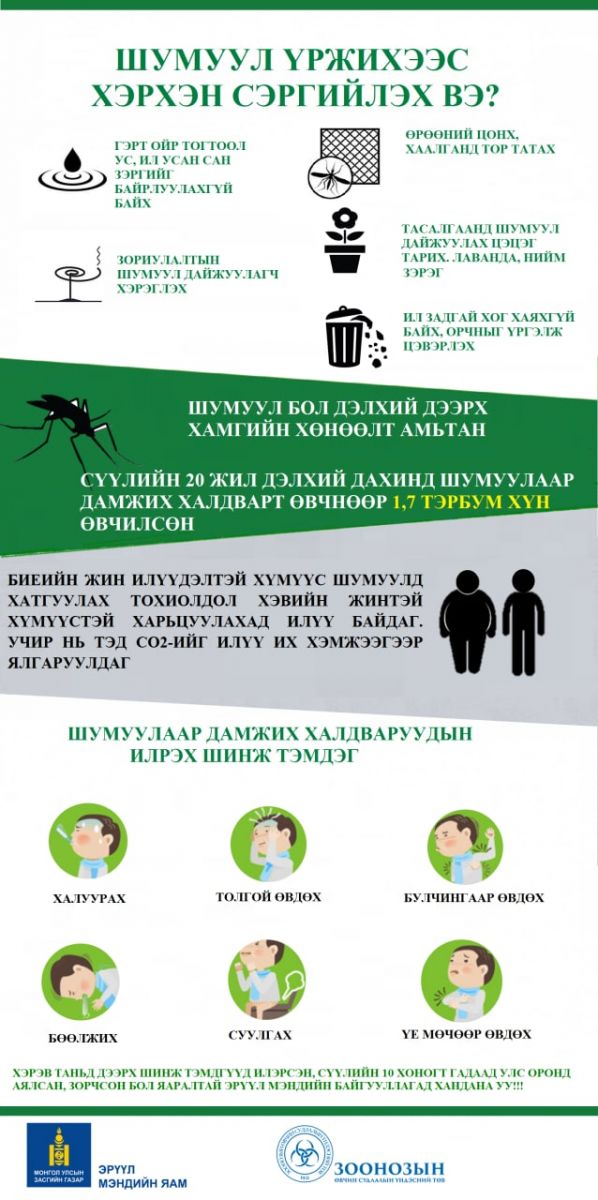 - Шумуул үржих нөхцөлийг таслан зогсоох буюу тогтонги ус үүсэхээс сэргийлэх, усны савыг тагтай байлгах;
