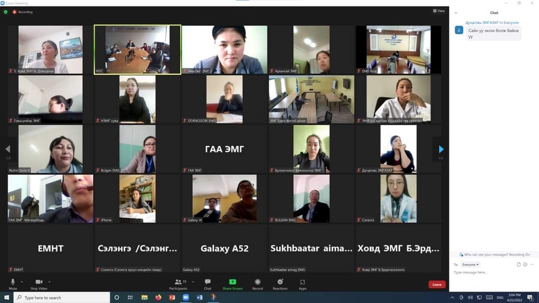 Эрт илрүүлэх үзлэг, шинжилгээ, оношилгоонд хамруулах үйл ажиллагаанд оролцох эмч, эмнэлгийн мэргэжилтнүүдийг чадавхижуулах, хүний нөөцийн бэлэн байдлыг хангахтай холбоотойгоор Аймаг, Нийслэлийн эрүүл мэндийн газрын хүний нөөцийн болон анхан шатны эрүүл мэндийн тусламжийн асуудал хариуцсан мэргэжилтнүүдтэй 2022 оны 04 сарын 22-нд цахим уулзалт хийж, 2022 оны 04 дүгээр сарын 23-24-ний өдрүүдэд зохион байгуулагдах “Хүүхдийн өвчний эрт илрүүлэг” сургалтад сум, өрхийн эрүүл мэндийн байгууллагын эмч, эмнэлгийн мэргэжилтнийг давтан хамруулах, хамрагдалтад хяналт хийж хамтран ажиллахаар санал солилцож, холбогдох мэдээллийг хүргэлээ.