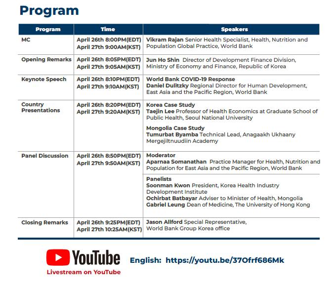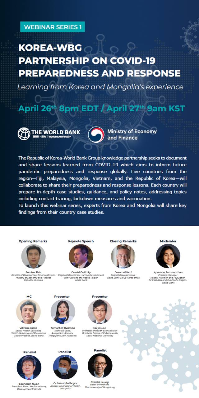 Дэлхийн банк, БНСУ-ын Эдийн засаг Санхүүгийн Яам хамтран БНСУ болон Монгол, Малайз, Фижи, Вьетнам улсуудын Цар тахлын үеийн бэлтгэл, авсан хариу арга хэмжээний чиглэлээ дүгнэн ярилцах вебинарыг 2022 оны 4 сарын 27 өдрийн 09:00 цагт зохион байгуулах гэж байна. Хөтөлбөрийн эхэнд БНСУ, Монгол 2 улсын цар тахлын эсрэг авсан арга хэмжээн дээр хийсэн үнэлгээний үр дүнг танилцуулна. Мөн тус 2 улсын мэргэжилтнүүд цар тахалтай тэмцсэн бодлогын бичиг баримтууд, хөл хорио, хавьтлын хяналт, вакцинжуулалтын талаар харилцан мэдээллээ солилцох юм. Олон нийт Монгол хэлний орчуулгатайгаар YouTube сувгаар үзэх боломжтой.