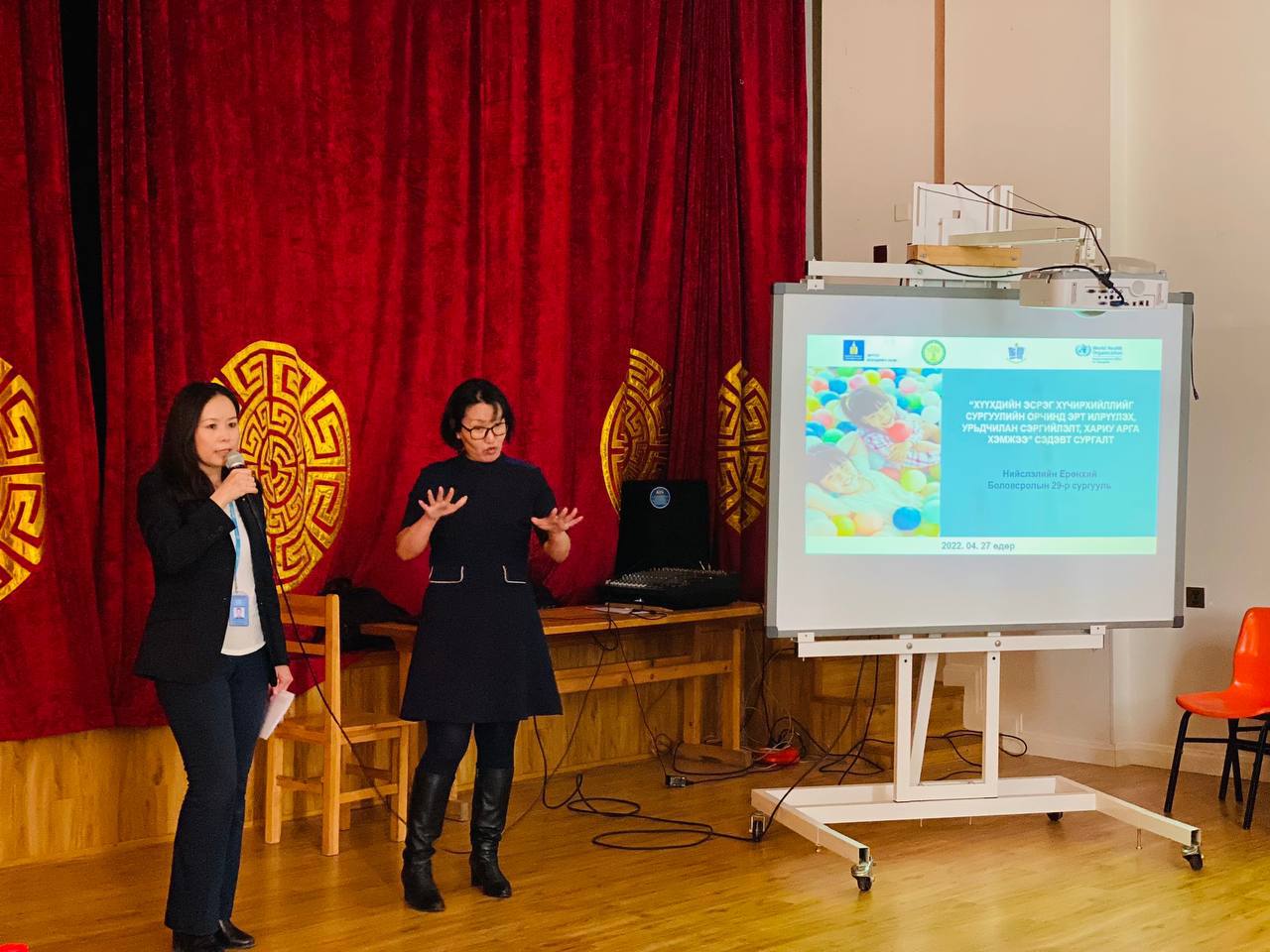 Сургалтын нээлтийн үйл ажиллагаанд ЭМЯ-ны Нийтийн эрүүл мэндийн газрын Халдварт бус өвчний хэлтсийн дарга Г.Ганхуяг, ЭМЯ-ны Осол гэмтэл, хүчирхийллийн асуудал хариуцсан мэргэжилтэн Б.Уянга, ДЭМБ-ын Осол гэмтэл, хүчирхийлэл хариуцсан мэргэжилтэн С.Болормаа, Нийслэлийн ерөнхий боловсролын 29-р сургуулийн захирал Д.Оюунсувд нар оролцлоо. Энэхүү сургалтыг хийснээр боловсролын салбар дахь хүүхэд хамгааллын асуудлыг эрчимжүүлж, хүүхдийг гэр бүлийн болон үе тэнгийн дээрэлхэлт, хүчирхийлэл, осол гэмтэлд өртөхөөс урьдчилан сэргийлэх ач холбогдолтой юм.