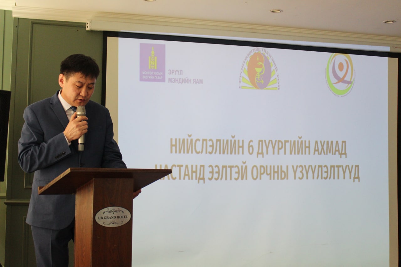 Иймд “ЭРҮҮЛ, ИДЭВХТЭЙ, ОРОЛЦООТОЙ НАСЖИЛТЫН ТӨЛӨӨ-ХАМТДАА УХУУЛГА НӨЛӨӨЛЛИЙН АЖИЛ” төслийн хүрээнд Дэлхийн эрүүл мэндийн байгууллагаас зөвлөдөг “Ахмад настанд ээлтэй орчны 8 үзүүлэлтийн 7 үзүүлэлтээр Нийслэлийн 6 дүүргийн ахмад настны орчны нөхцөл байдалд судалгаа хийж, судалгааны үр дүнг Эрүүл мэндийн яам, Геронтологийн үндэсний төв, Монголын ахмадын холбооны төлөөлөл хэлэлцэн, цаашид бодлогын болон хэрэгжилтийн шатанд эрчимжүүлэх үйл ажиллагааны чиглэлийг тодорхойллоо.