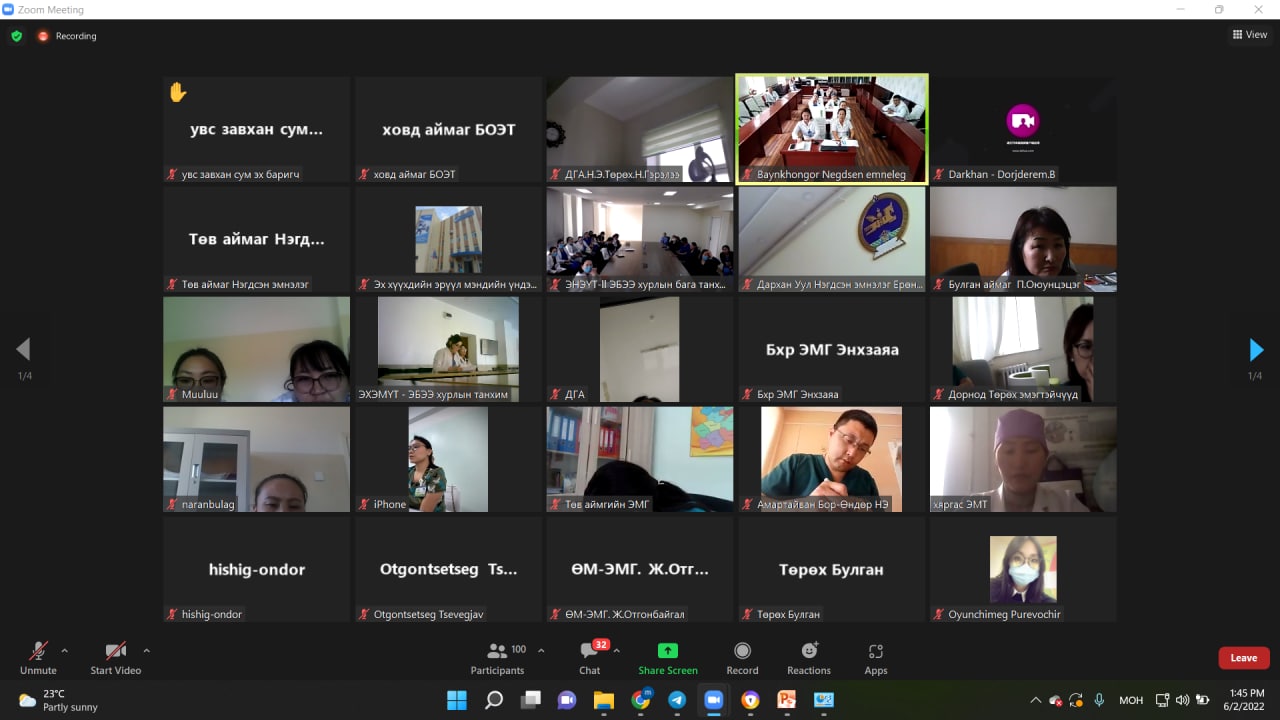 ЭХЭМҮТ-ийн Тандалт судалгааны албанаас 2022 оны эхний 5 сарын байдлаарх эхийн эндэгдлийн тохиолдлыг танилцуулж, “Жирэмсэн үеийн амьсгалын замын эмгэг, зүрхний төрөлхийн гажгийн орчин үеийн эмчилгээ, тусламж үйлчилгээ” сэдэвт цахим хурлыг 2022 оны 06 дугаар сарын 02-ны өдөр зохион байгууллаа. Эхийн ноцтой хүндрэл, эндэгдлээс сэргийлэх зорилго бүхий цахим хурлыг Эх барих эмэгтэйчүүдийн эмнэлгийн ЭМТҮЧАБА-ны менежер М.Камара удирдан явууллаа. Хуралд ЭХЭМҮТ-ийн эх барих эмэгтэйчүүдийн зөвлөх эмч нар, НҮЗП-ийн дотор, зүрх судасны эмч, Статистик мэдээлэл зүйн тасаг, Тандалт судалгааны албаны эмч судлаачид, Хүрээ амаржих газар, ЭНЭҮТ II, Сүхбаатар дүүргийн ЭМТ, аймгуудын ЭМГ-ын удирдлага, эх барих эмэгтэйчүүдийн асуудал хариуцсан мэргэжилтэн, аймгийн нэгдсэн эмнэлэг, БОЭТ-ийн эх барих эмэгтэйчүүдийн зөвлөх эмч, ЭМТҮЧАБА-ны дарга, менежер, эх барих эмэгтэйчүүдийн эмч, сумдын эмч нар, нийгмийн ажилтан бүхий 213 эмч, мэргэжилтэн 100 холболтоос цахимаар оролцлоо.