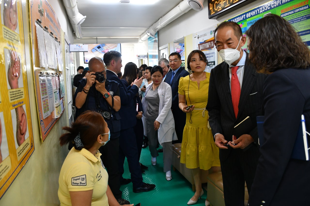 Дэлхийн эрүүл мэндийн байгууллагын Номхон далайн баруун бүсийн захирал Др Такеши Касай болон ажлын хэсгийн бүрэлдэхүүн СХД-ийн “Гурван жаргал хайрхан” өрхийн эрүүл мэндийн төвд /2022.06.17/ өдөр ажиллалаа. Тус өрхийн эрүүл мэндийн төв нь 12мянга 767 хүн амд эмнэлгийн тусламж үйлчилгээ үзүүлдэг. Үүний 0-15 насны хүн ам 33.1%, насанд хүрэгчид 63%, жирэмсэн эмэгтэйчүүд 33%-г эзэлдэг байна. Энэ үеэр МонПэн загвар төсөл, санаачилгын хэрэгжилтийн талаар ЭМЯ-ны НЭМГ-ын дарга Д.Баярболд танилцуулав. Эрүүл мэндийн анхан шатны тусламж үйлчилгээний түвшинд зүрх судасны өвчнөөс сэргийлэх, хянах нэн шаардлагатай тусламж үйлчилгээний багцыг нэвтрүүлсэн туршлага, гаргасан үр дүнгийн талаар онцолсон юм.