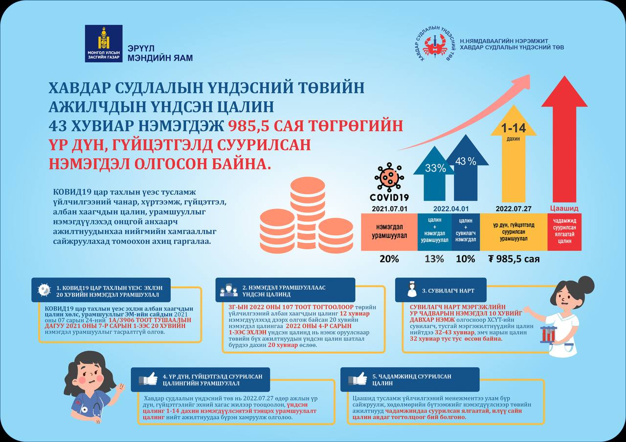 Уулзалтын үеэр Эрүүл мэндийн сайд С.Энхболд 2022 оны 8 сарыг Эрүүл мэндийн ажилчдын Нийгмийн хамгааллыг дэмжих сар болгон зарлаж байгааг мэдэгдсэн бөгөөд тэрээр Засгийн газрын зүгээс 2022 оны 1 улиралд эрүүл мэндийн ажилчдын цалингийн доод жишгийг тогтоосон 107 дугаар тогтоолыг баталсны үр дүнд эрүүл мэндийн байгууллагууд эмч, ажилчдын цалинг нэмэгдүүлж эхэлснийг сайшаан тэмдэглэлээ. Тухайлбал, Эрүүл мэндийн сайд өнгөрсөн 7 хоногт Өвөрхангай аймгийн Хархорин суманд албан томилолтоор ажиллах үед эмнэлгийн удирдлага “эмч, ажилчдын үндсэн цалинг 10-25 хувиар нэмэгдүүлж, улирал бүр урамшуулал олгож байгаа” талаар танилцуулсан жишээг дурьдлаа. Мөн хурал дээр Хавдар судлалын үндэсний төв эмч, ажилчиддаа 15 сая хүртэлх төгрөгийн нэг удаагийн урамшуулал олгосон бол Гэмтэл согог судлалын үндэсний төв 2022 он гарсаар эмч, эмнэлгийн ажилчиддаа 500.000 төгрөгийн урамшуулал олгож, сувилагч нарын үндсэн цалинг 10-25 хувиар нэмсэн талаараа мэдээллээ. Баянгол дүүргийн эрүүл мэндийн төв 2021 онд нийт ажилчдынхаа цалинг 30 хувь нэмэгдүүлсэн бол 2022 онд гүйцэтгэлтэй нь уялдуулан 20 хувь нэмэгдүүлсэн байна. Амгалан төрөх газар 2022 оны 7 сарын 1 өдрөөс эмч эмнэлгийн ажилчдын цалингаа 10-20 хувиар нэмсэн байна.