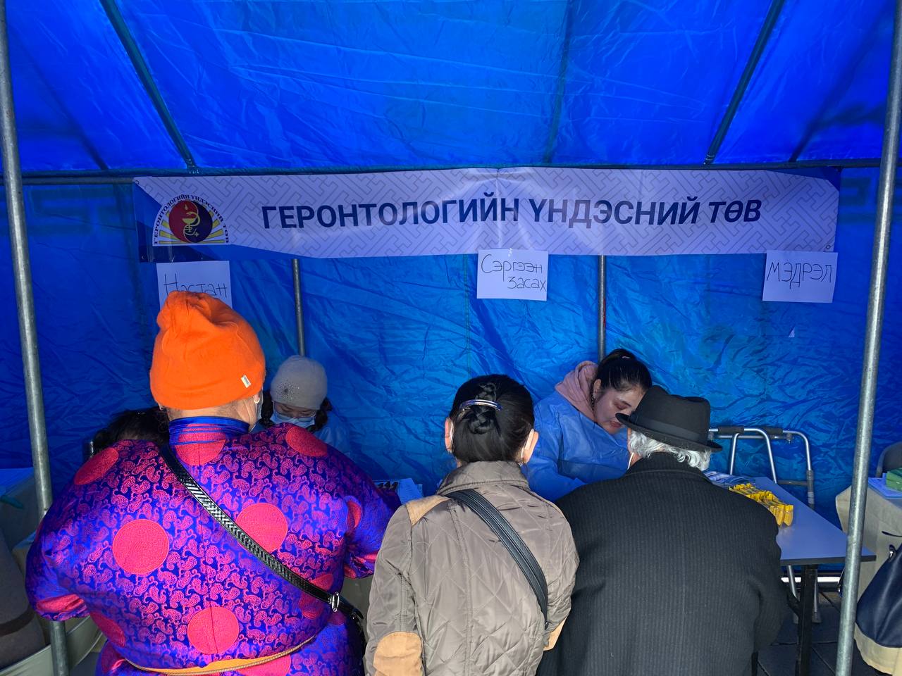 Төв талбай дээр Геронтологийн үндэсний төв бүрэн бүрэлдэхүүнээр ажиллахын зэрэгцээгээр дүүргүүдийн настны эмч тусламж үйлчилгээг үзүүлэн ажиллаж байна.