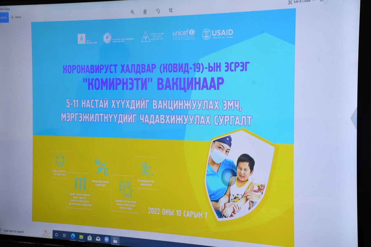 “КОРОНАВИРУСТ ХАЛДВАР (КОВИД-19)-ЫН ЭСРЭГ "КОМИРНЭТИ" ВАКЦИНААР 5-11 НАСНЫ ХҮҮХДИЙГ ВАКЦИНЖУУЛАХАД ЭМЧ, МЭРГЭЖИЛТНҮҮДИЙГ ЧАДАВХИЖУУЛАХ” сэдэвт сургалт өчигдөр ЭМЯ-ны хурлын зааланд боллоо.