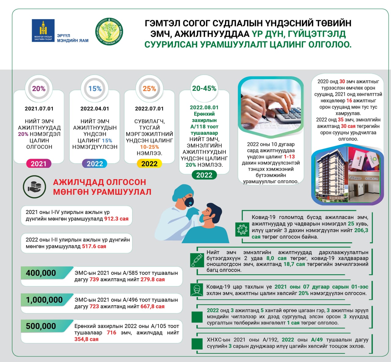 Эрүүл мэндийн сайд С.Энхболд бүх эрүүл мэндийн байгууллагуудад хандан гүйцэтгэлээрээ санхүүжиж байгаа боломж, нөөцөө ашиглан нэн түрүүнд эмч, ажилтнуудаа дэмжих, нийгмийн асуудал дээр нь анхаарах, тогтвортой ажиллуулахад цалин урамшууллын систем дээр нь анхаарч ажиллахыг үүрэг болгосон. Өөрөөр хэлбэл эрүүл мэндийн салбарын ажилтны цалингийн тааз буюу дээд хязгаарыг байхгүй болгож, суурь цалинг нэмэгдүүлсэн билээ.