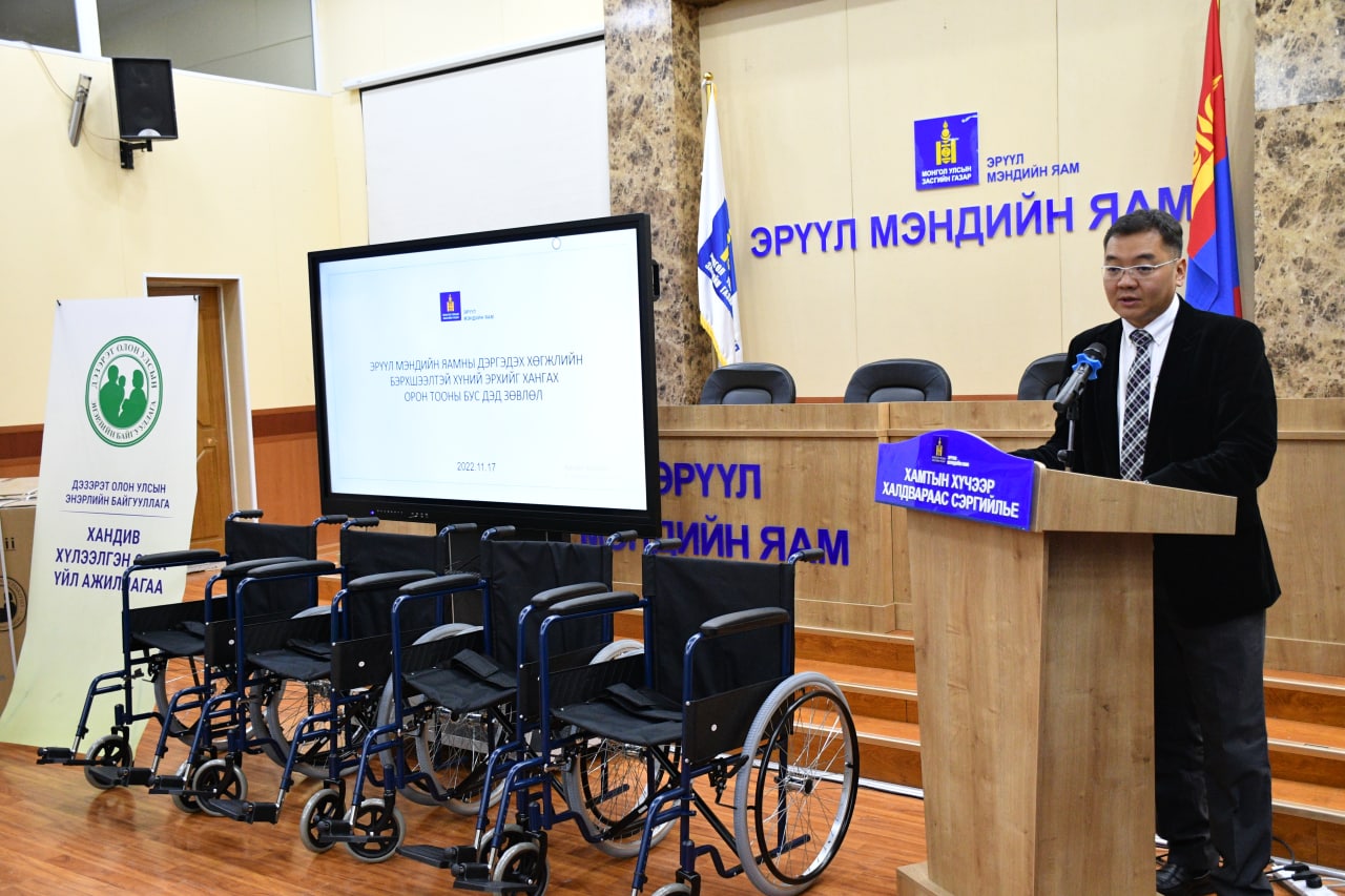 Өчигдөр буюу 2022 оны 11 дүгээр сарын 17-ны өдөр хөгжлийн бэрхшээлтэй иргэдэд үзүүлэх тусламж, үйлчилгээг хүртээмжтэй, саадгүй хүргэх зорилгоор олон улсын байгууллагын дэмжлэгээр 21 аймаг, нийслэлийн 47 эрүүл мэндийн байгууллагад 258 ширхэг тэргэнцэр олгох үйл ажиллагаа боллоо.
