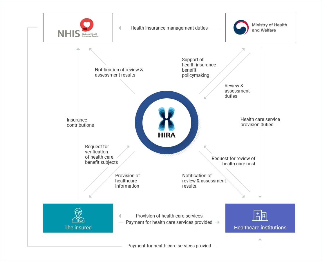 Мөн тус байгууллага нь эрүүл мэндийн яамаа эрүүл мэндийн даатгалын үйл ажиллагаатай холбоотой бодлогын өөрчлөлт хийхэд шаардлагатай мэдээлэл ба датагаар хангадаг бол эрүүл мэндийн даатгалын газраа нэхэмжлэлийн хяналт ба нэхэмжлэл тусламж үйлчилгээтэй холбоотой мэдээлэлээр хангаж шаардлагатай бол анхааруулга санамж илгээж байдаг байна. Тус байгууллага нь эрүүл мэндийн даатгалаас зарцуулж буй мөнгийг үр ашигтай зарцуулахын төлөө ажилладаг гэсэн үг юм. Энэхүү мэдээлэл ба судалгаа дээр үндэслэн эрүүл мэндийн яам ба эрүүл мэндийн даатгалын газар нь эрүүл мэндийн даатгалын үйл ажиллагааны менежментийг хийж байдаг байна. Эмнэлэгийн тусламжийн чанарыг сайжруулахын тулд чанарын үнэлгээг мөн хийж байдаг байна. Үүнд даатгалтай гэрээт байгууллагуудын тусламж үйлчилгээнд өвчтний аюулгүй байдал, эмчилгээний үр дүн, өвчтөн төвтэй тусламж үйлчилгээ, эмийн зардал ба чанар, тусламж үйлчилгээний тэгш байдал, уялдаатай байдалд үнэлгээ хийж үр дүнг олон нийтэд цахимаар мэдээлж байдаг ажээ.БНСУ гадаадад очин оношилгоо, эмчилгээ, хагалгаа хийж буй эмч нарт хяналт тавьж байдаг ба гадаадад явж буй эмч нар энэхүү байгууллагаар бүртгүүлж байж явдаг байна. Монгол улсаас бас нэг онцлог нь тусламж үйлчилгээ үзүүлэгч эхний ээлжинд нэхэмжлэлээ энэхүү Эрүүл Мэндийн Даатгалын тусламж үйлчилгээнд Хөндлөнгийн хяналт тавьдаг агентлаг лүү илгээж энэ байгууллага хяналт хийсний дараагаар нэхэмжлэлийг цааш даатгалын байгууллага лүү илгээдэг ажээ. Тус байгууллага нь 80000 гаруй эрүүл мэндийн байгууллагуудын нэхэмжлэлд хяналтын үйл ажиллагаа хийж даатгалаас санхүүжилт авах эрхийг нээдэг ажээ. Мөн тус байгууллага нь эрүүл мэндийн салбарын нөөцийн тухайлбал хүний нөөц, эм эмнэлгийн хэрэгслийн нөөц, эмнэлгийн байгууламжийн нөөцийн (сэхээний ор, тоног төхөөрөмж, сөрөг даралттай өрөөний тоо гэх мэт ) мэдээллийг цуглуулж нэхэмжлэлд хяналт хийхдээ ашигладаг байна. Мөн Олон улсын эрүүл мэндийн даатгалын чиглэлээр сургалтыг өөр дээрээ хийдэг бөгөөд дэлхийн олон орны даатгалын байгууллага зүгээс ирж туршлага судалдаг байна.