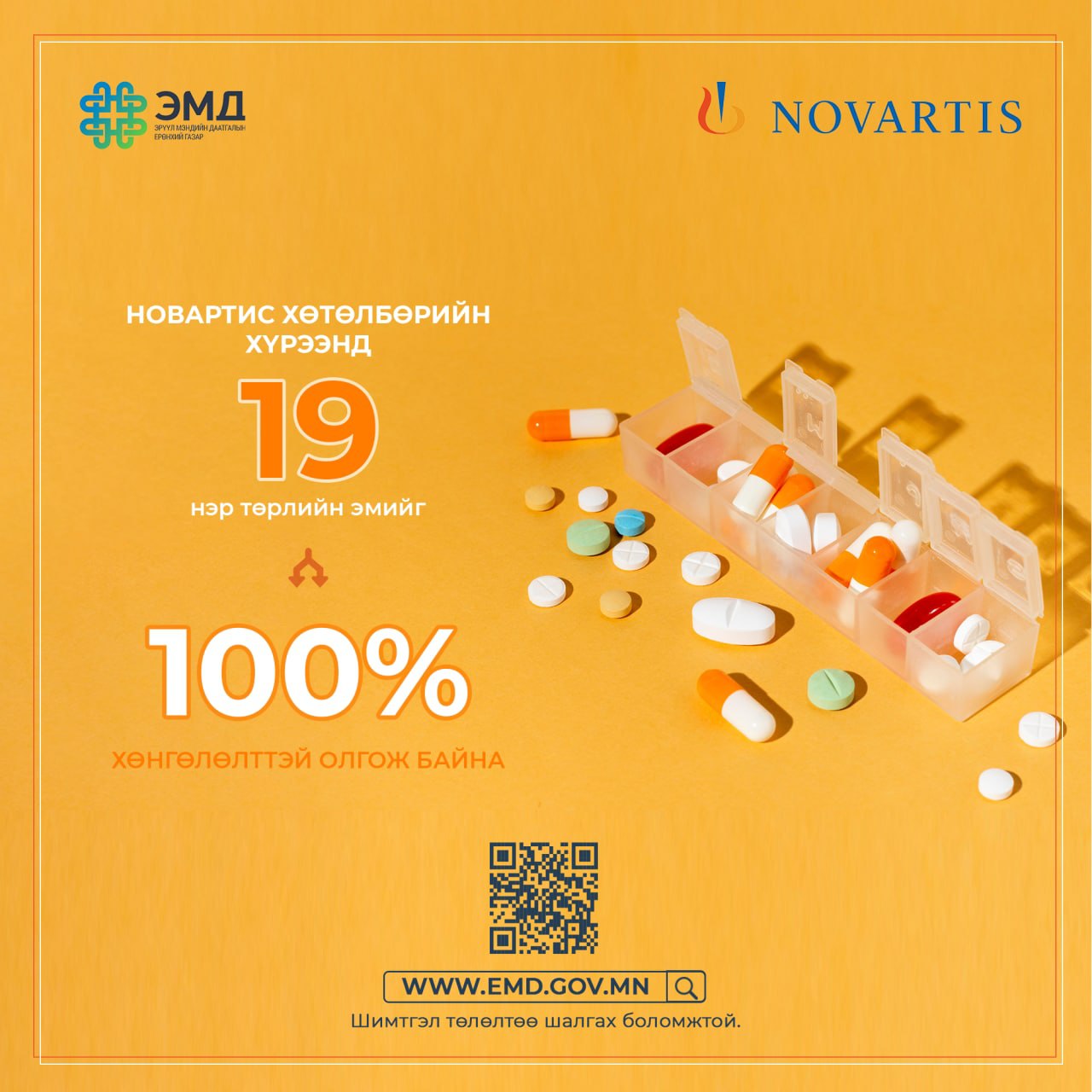 ЭМДЕГ , Швейцарийн Новартис компанитай хамтран олон улсад хүлээн зөвшөөрөгдсөн зүрх судас, чихрийн шижин, уушгины эмгэг болон хавдрын үед хэрэглэх 19 төрлийн эмийг ЭМД-ын шимтгэлээ төлсөн хүн бүрд ЭМД-ын сангаас 100 хувь хөнгөлөлттэй үнээр олгож байна.Эдгээр эмийг эхний ээлжинд "Новартис" компанийн албан ёсны 3 дистрибьютерийн 191 салбар эмийн сангаар олгож байсан бол эмийн хүртээмжийг нэмэгдүүлэх зорилгоор ЭМДЕГ-тай гэрээтэй бусад эмийн сангууд ч мөн олгох боломжтой болсон.