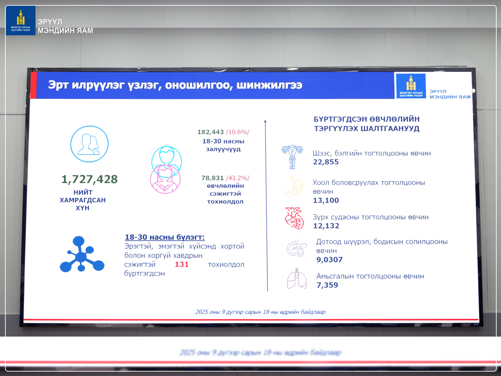 ЭМЯ-ны Нийгмийн эрүүл мэндийн бодлогын хэрэгжилтийн газрын дарга Б.Цэцэгсайхан залуучуудын чиглэлээр эрүүл мэндийн салбарт баримталж буй бодлого, авч хэрэгжүүлж байгаа арга хэмжээг танилцуулав. Улс орон даяар зохион байгуулагдсан эрт илрүүлэг, урьдчилан сэргийлэх үзлэгт 18-30 насны залуучуудын зөвхөн 10,6 хувь нь хамрагдсан нь хангалтгүй үзүүлэлт гэдгийг танилцуулгын эхэнд дурдлаа. Хөдөлмөрийн насны хүн амд 15-34 насны залуус 42.2 хувийг нь эзэлдэг. Хүн амын тэн хагасыг нь залуучууд эзэлж байна гэсэн үг. Дээрх эрт илрүүлгээр 78 мянган өвчлөлийн сэжигтэй тохиолдол бүртгэгдэж, 18-30 насны залуусын дунд хавдрын 131 сэжигтэй тохиолдол бүртгэгджээ.