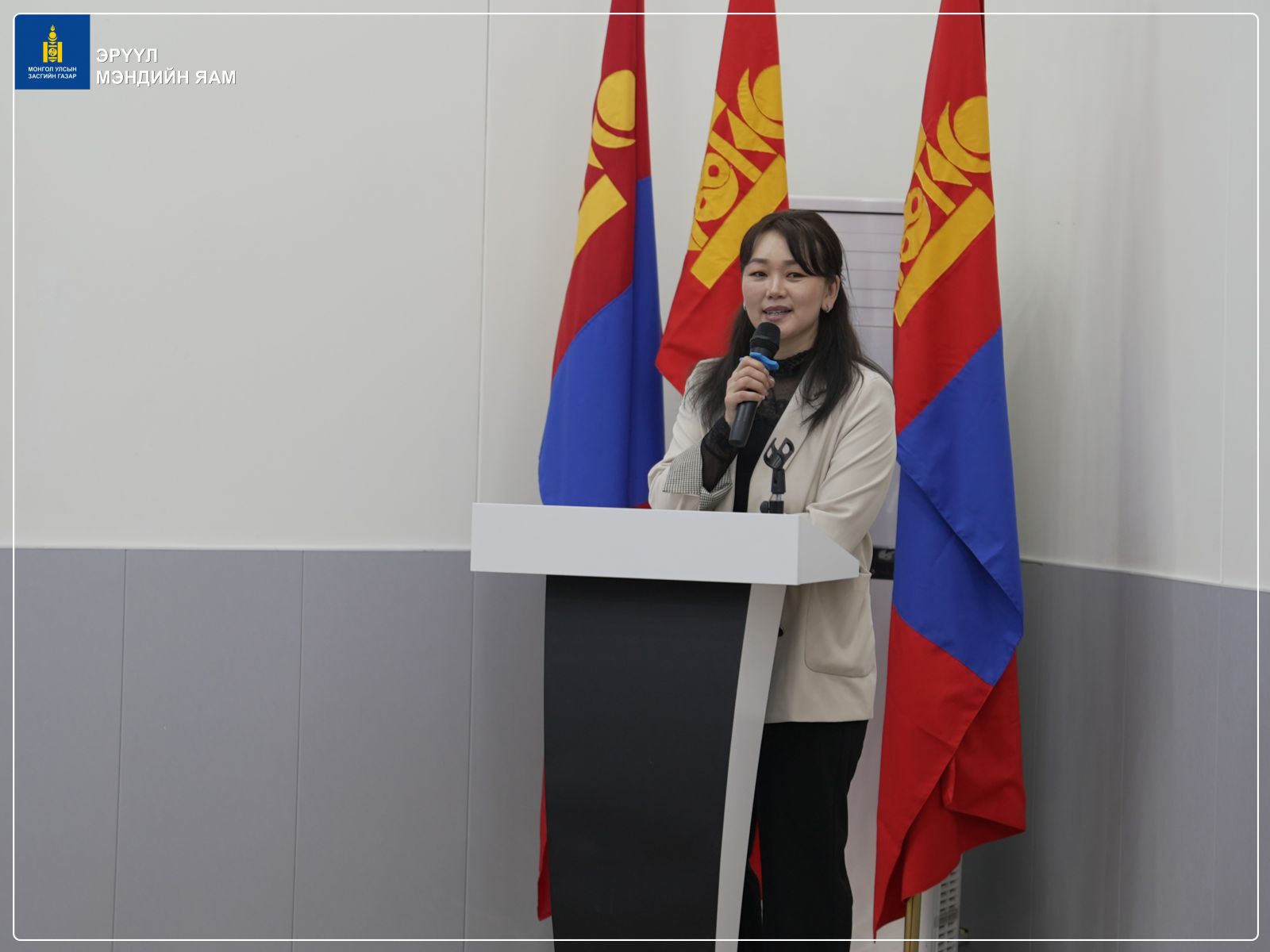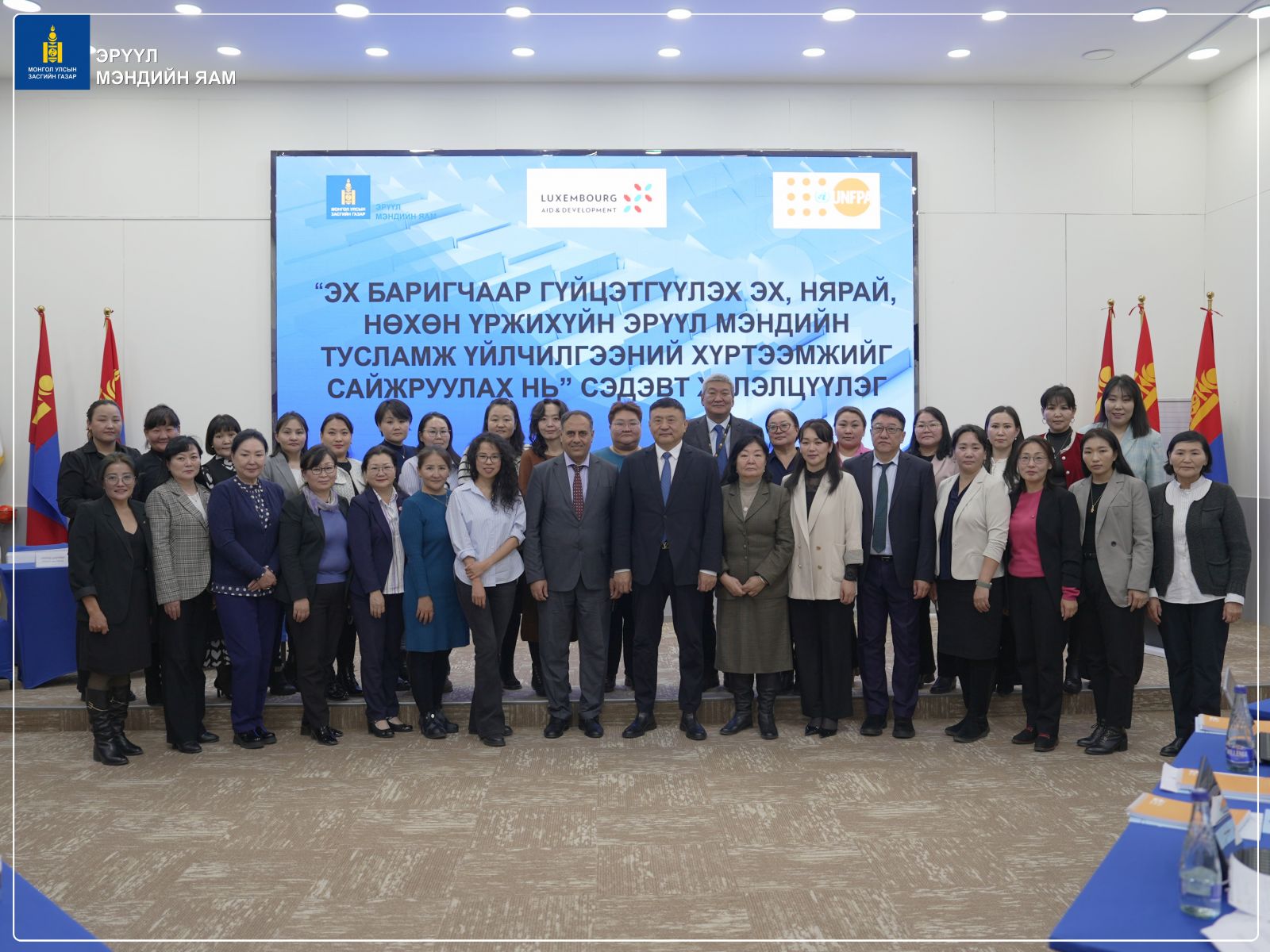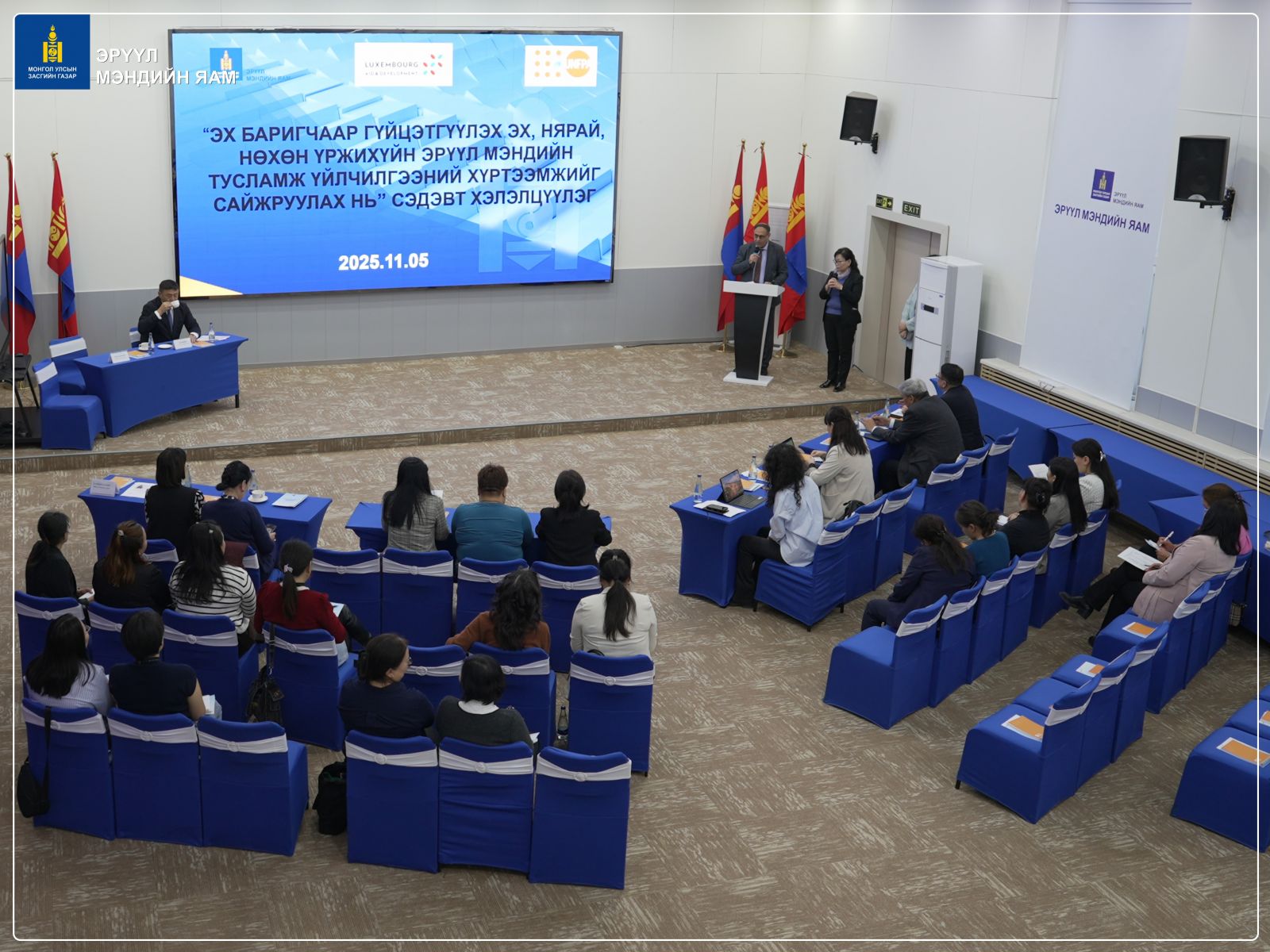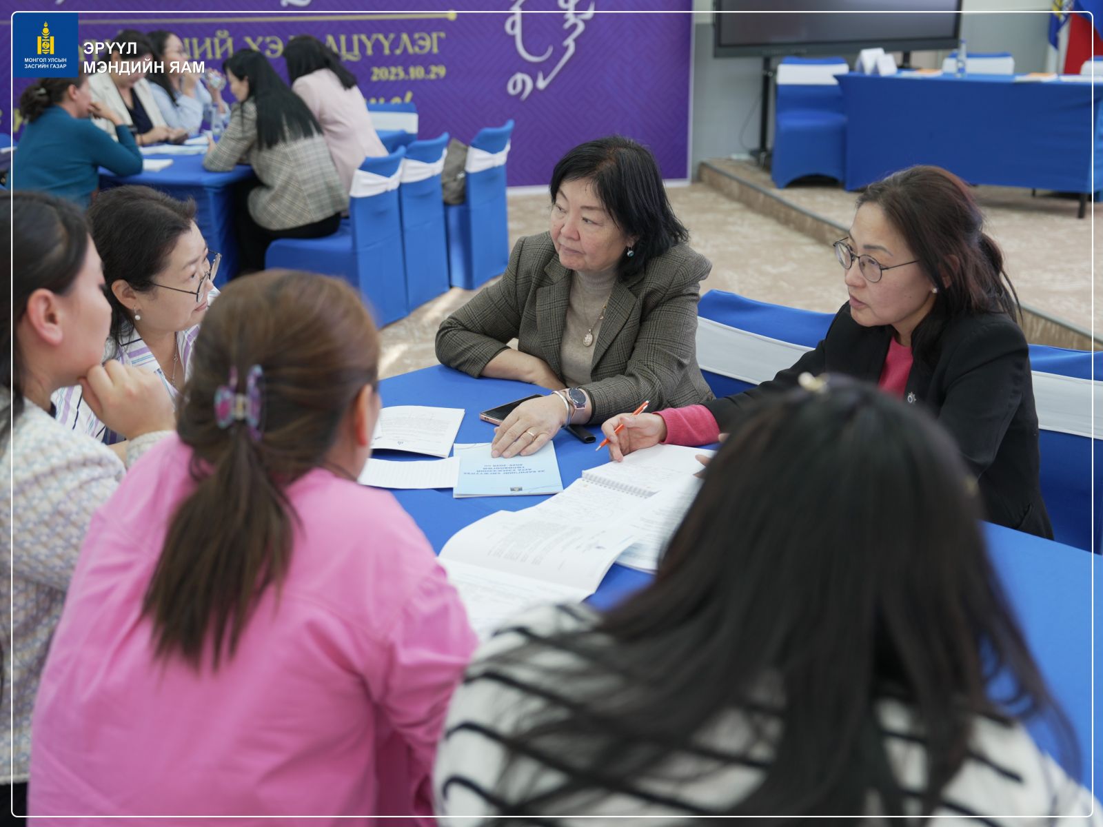 “Эх баригчаар гүйцэтгүүлэх эх, нярай, нөхөн үржихүйн эрүүл мэндийн тусламж, үйлчилгээний хүртээмжийг сайжруулах нь” хэлэлцүүлгийг өнөөдөр ЭМЯ-нд зохион байгууллаа. (2025.11.05) Эрүүл мэндийн сайдын 2025 оны A/264 дугаар тушаалаар батлагдсан, “Эх баригчийг хөгжүүлэх арга хэмжээний төлөвлөгөө 2025-2028”-ний хэрэгжилтийг хангах зорилгоор уг хэлэлцүүлэгийг хийж байгаа юм.
