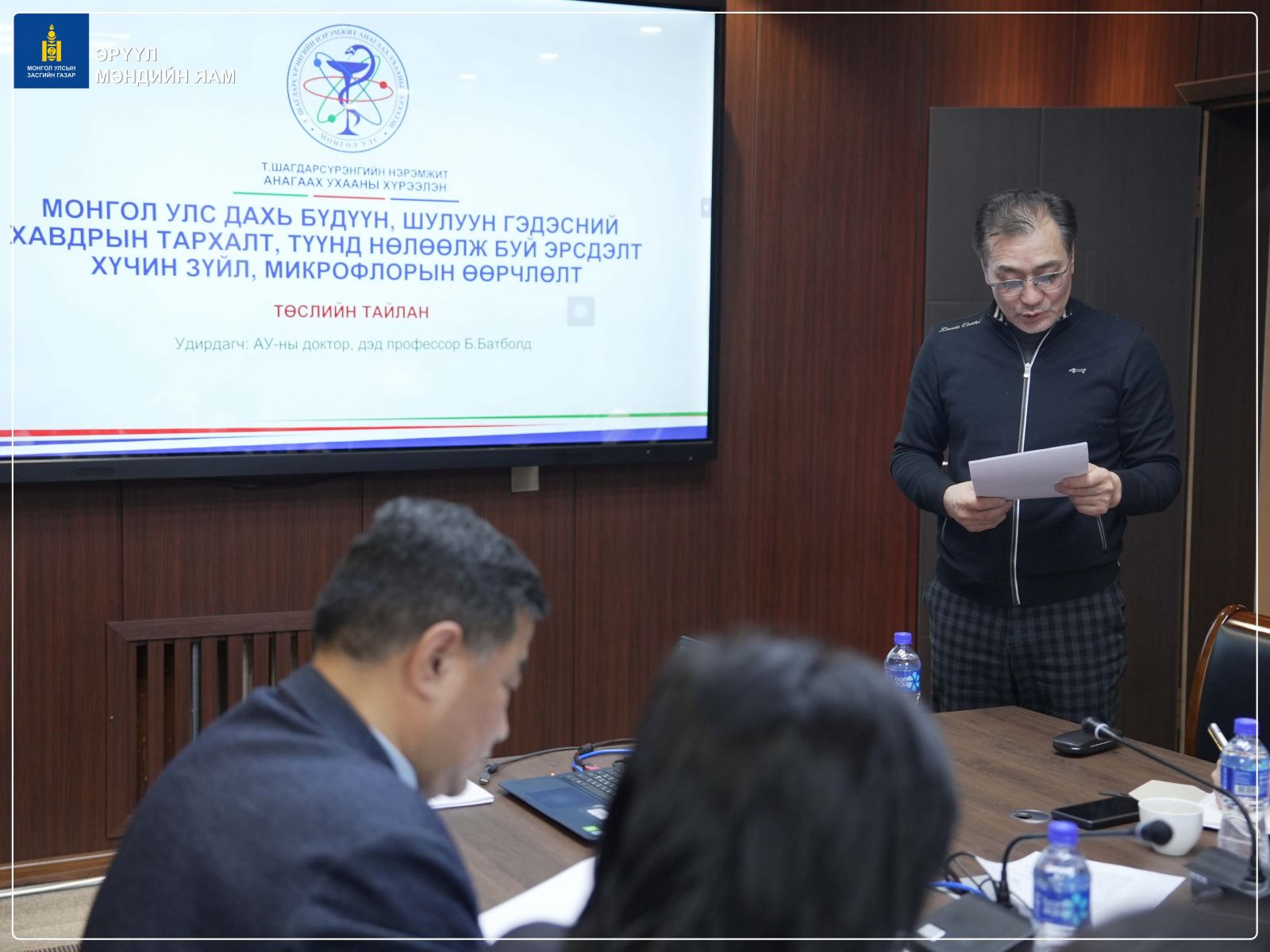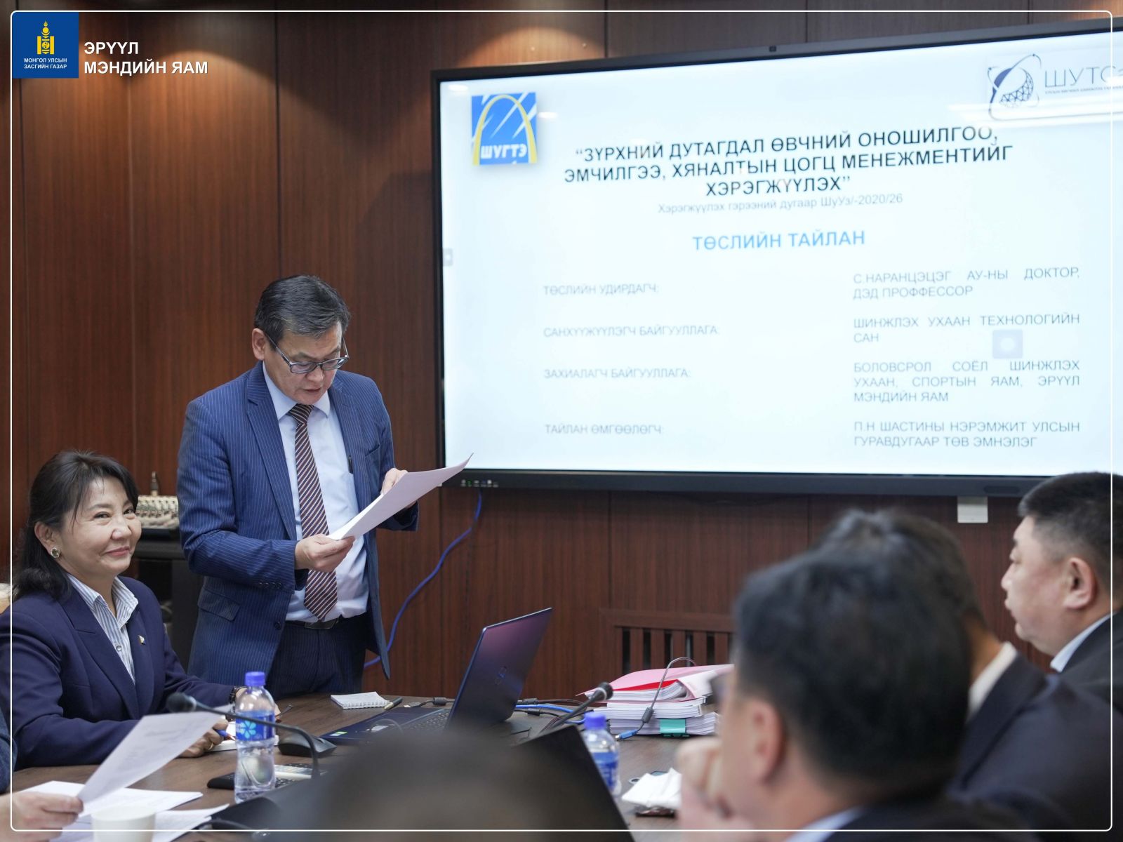 Хурлыг Эрүүл мэндийн сайд, ШУТЗ-ийн дарга, Анагаах ухааны доктор Ж.Чинбүрэн удирдан явуулав. Өнөөдрийн хурлаар 2019-2025 онд хэрэгжүүлж гүйцэтгэсэн эрүүл мэндийн чиглэлийн шинжлэх ухаан, технологийн дараах төслүүдийн үр дүнг хэлэлцлээ. Үүнд: